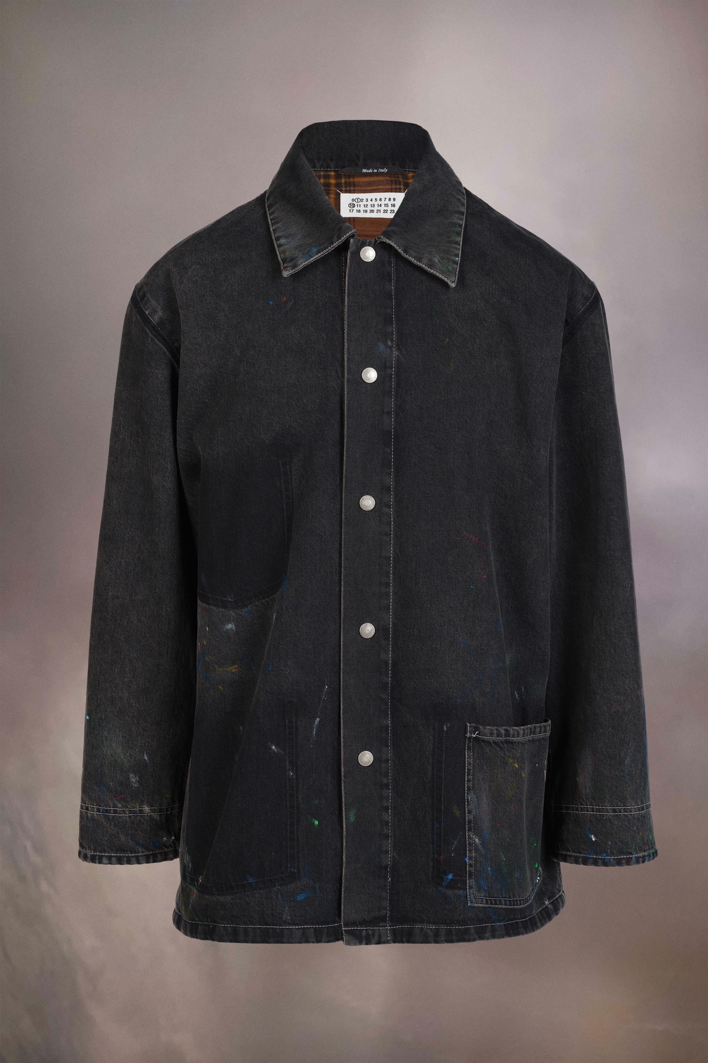 Capturing the essence of an artist at work in his studio, this long-line denim shirt jacket is artfully paint-splattered. It features memory of pockets, a house design code and an asymmetric pocket. Maison Margiela's signature, the four white stitches, appear at the back; the opposite of a label.