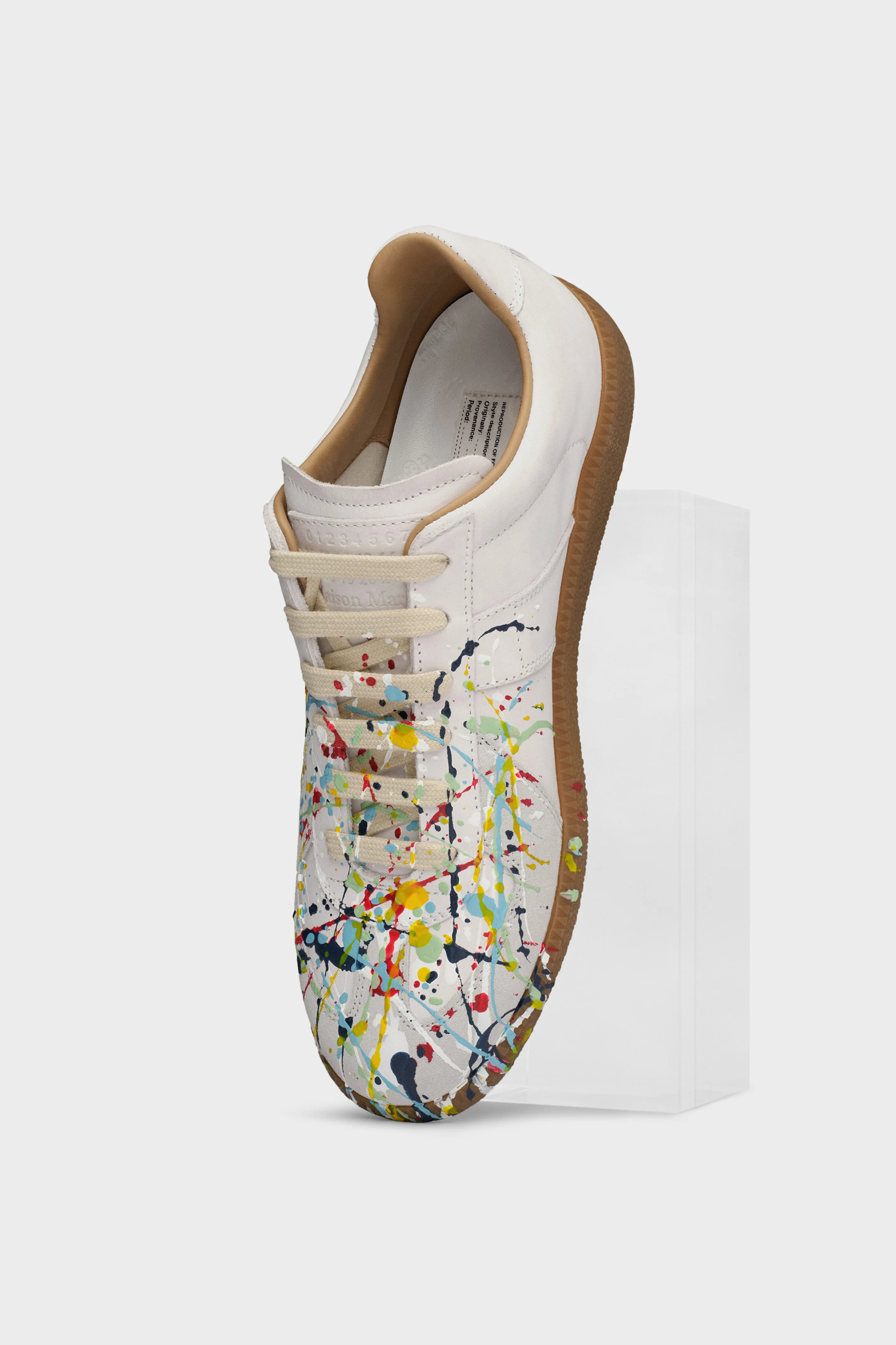 The Replica sneakers in nubuck leather and velour featuring a paint splatter design. The Maison's iconic Replica sneakers are inspired by Austrian sports shoes from the seventies. Details on the Replica pairs are continually reworked in line with the season's inspirations. Product Details Item ID S58WS0101P1892961 Upper: 100% Calf leather Contrast: 100% Calf leather Lining: 100% Cotton Sole: 100% Rubber Logo label on the tab White stitching at the back Handmade color treatment Internal Replica label Internal elastic All-over logo insole Gently rub using a microfiber cloth with softner to clean to clean Made in Italy A digital certificate provided by the Aura Blockchain Consortium guarantees the authenticity of this product. Discover more on auraluxuryblockchain.com/#about