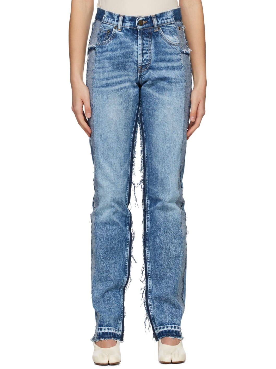Straight-leg paneled non-stretch recycled denim jeans in tones of blue. Mid-rise. Fading, whiskering, white topstitching, raw edges, and exposed seams throughout. Two-pocket styling. Belt loops at waistband. Button-fly. Antiqued bronze-tone hardware. Supplier color: Blue denim Body: 100% cotton. Trim: 65% polyester, 35% cotton.