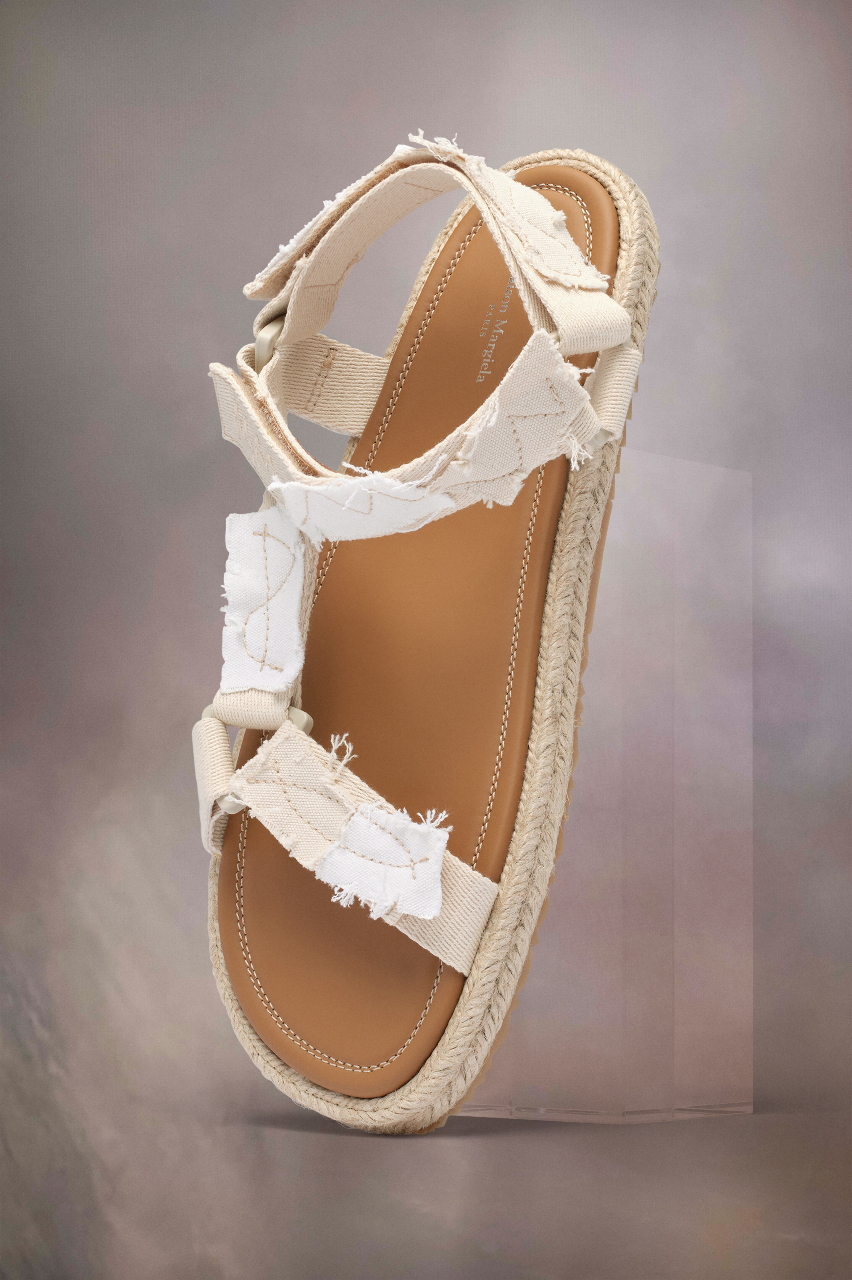 The hiking sandals come in the Maison's patchwork canvas, with a deliberately distressed aesthetic. The stitching is visible and the edges kept raw, complete with hessian to the soles.