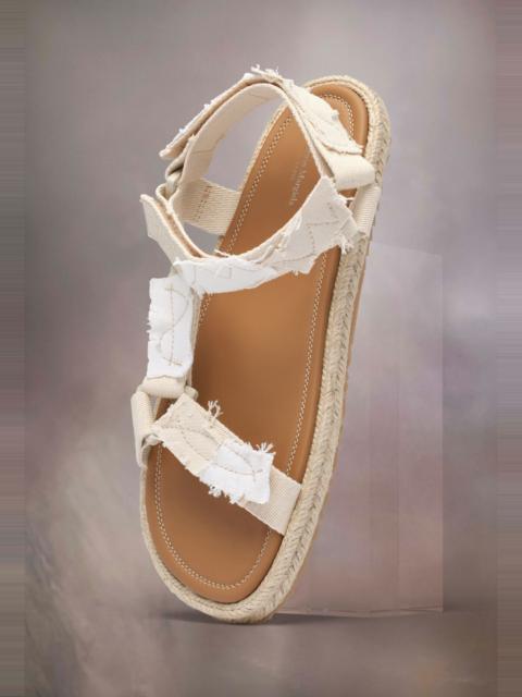 The hiking sandals come in the Maison's patchwork canvas, with a deliberately distressed aesthetic. The stitching is visible and the edges kept raw, complete with hessian to the soles.