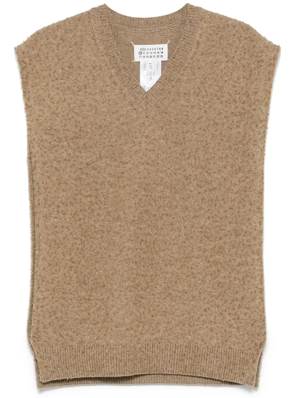 piled-knit vest Highlights - Light brown - Side button fastening - Ribbed v-neck - Sleeveless - Ribbed hem Made in Italy Composition Wool 55%, Cotton 45% SIZE & FIT Model measurements Height 5 ft 11 in(1.8 m) Bust/Chest 31.49 in(80 cm) Hips 35.82 in(91 cm) Waist 24.8 in(63 cm) FittingInformation Designed to be unstructured, offering a loose fit throughout Made with a midweight knit, this piece offers some stretch