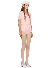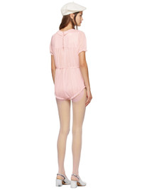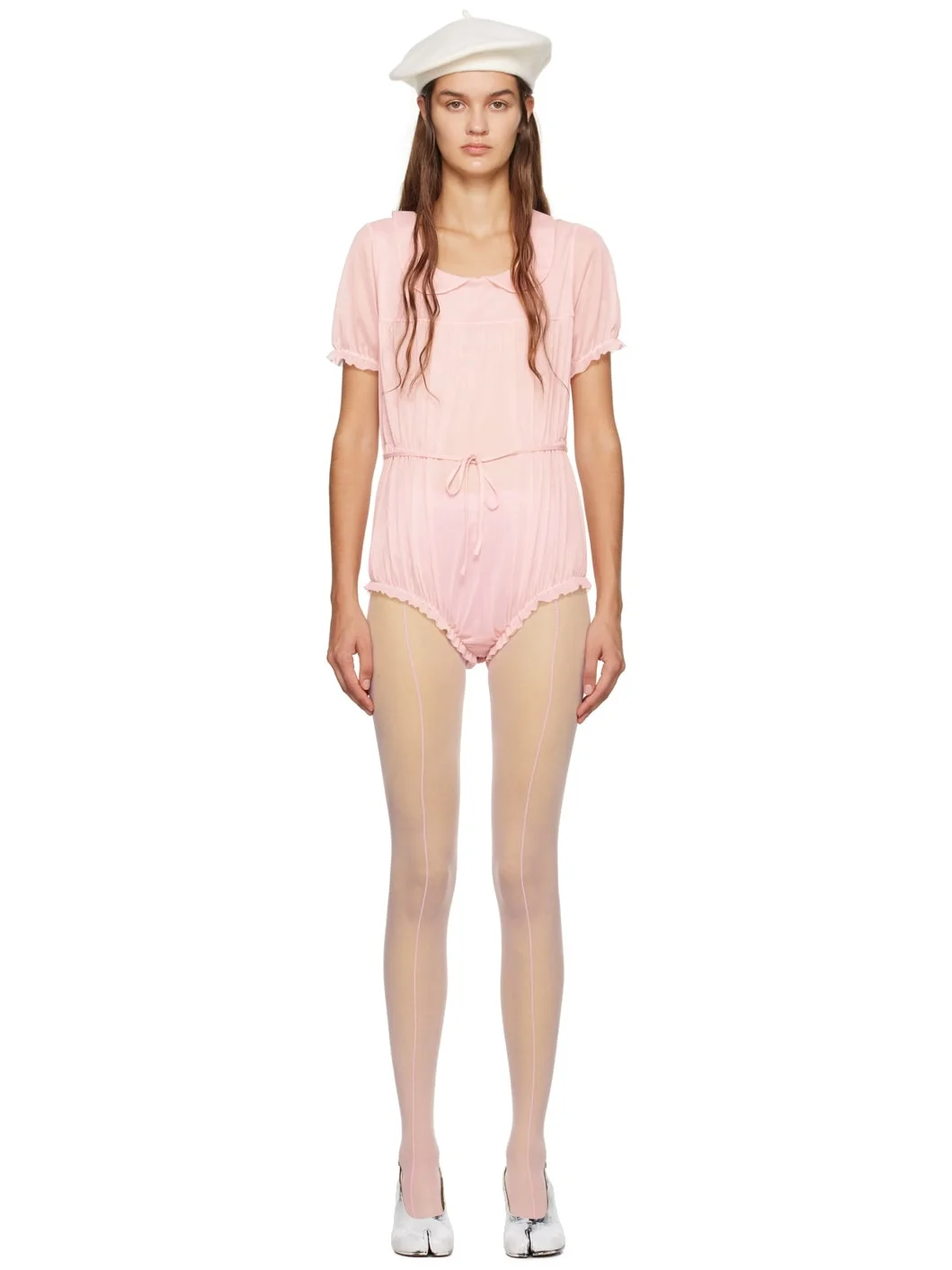 Sheer nylon mesh bodysuit. Gathering and ruffled trim throughout. · Peter Pan collar · Self-tie fastening at waist · Press-stud fastening at bottom · Puff sleeves · Half-button closure and white stitching at back Supplier color: Pink