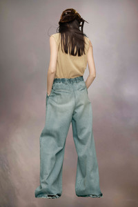 Creating an oversized silhouette, the wide-leg jeans display pleat details at the front and an unexpected elasticated waistband at the back. They are designed with four pockets and wide belt loops, and fasten with a fly and button as well as the Margiela hook closure. They come in a washed finish with distressed hems to complete the extra-long length. Maison Margiela's signature, the four stitches, appear at the back; the opposite of a label. Product Details Item ID S51KA0605S30383961 Primary Fabric: 100% Cotton Pocket Lining: 65% Polyester 35% Cotton Cotton 5-pockets trousers High-waisted Wide-leg Loose from thigh to hem Belt loops Zip and button closure Full length, touching or covering the shoes Four stitches at the back Made in Italy Model is 180 cm tall and wears a size 40.