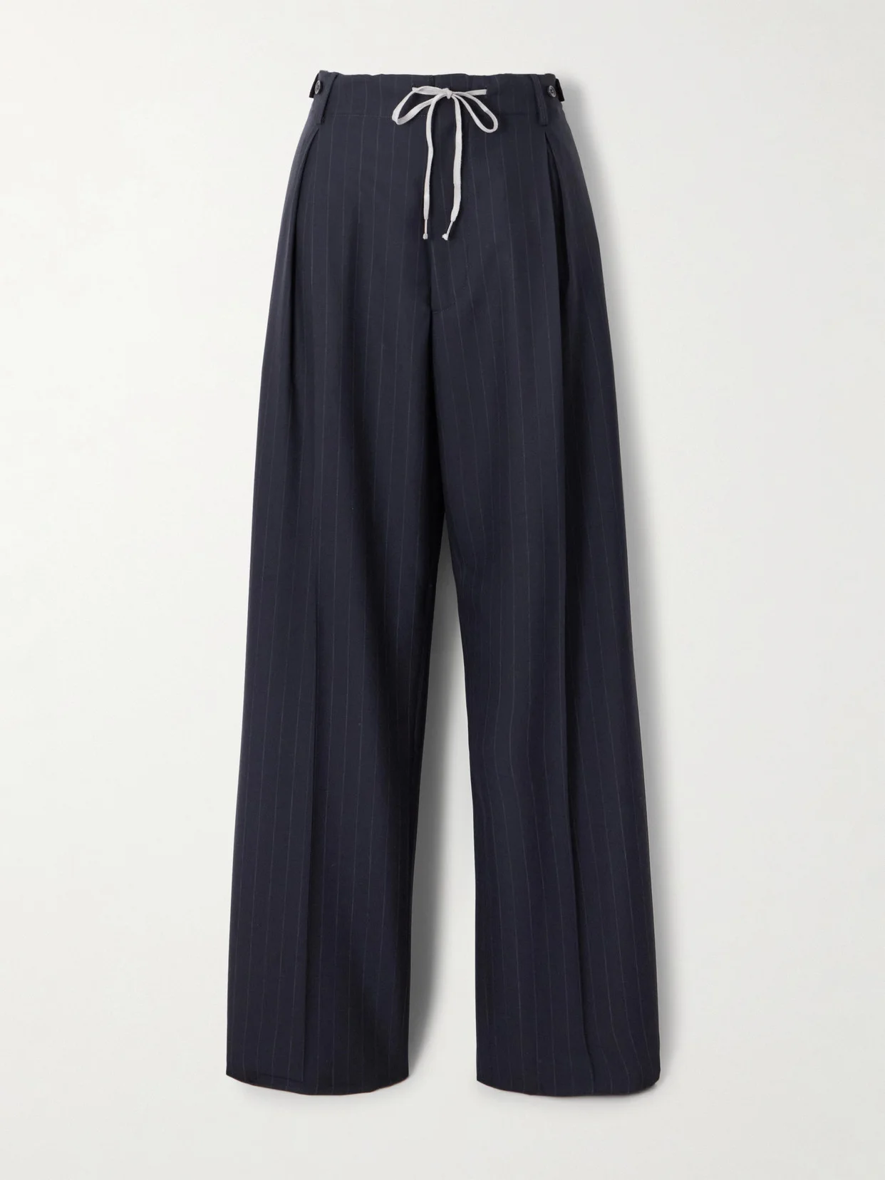 Maison Margiela's pants are designed with a drawstring waistband, adding a sporty element to classic tailoring. They're cut from pinstriped wool and have front pleats and wide legs.