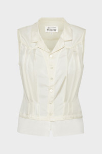 Silk tailoring is deconstructed in this sleeveless blouse, defined by sculptural pleats, exposed inner seams, and a contrast hem that gestures to shirting. A flat collar and button-up front introduce classic details, while the silhouette balances softness with structure for a modern take on traditional form. Maison Margiela’s signature, the four stitches, appear at the back; the opposite of a label. Product Details Item ID S51NC0628M35534102 Primary Fabric: 63% Polyamide-Nylon 37% Silk Sleeveless button-front shirt Pointed collar Pleated detailing Fitted waist with a contrast hem panel Four stitches at the back Made in Italy