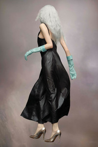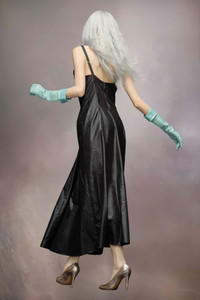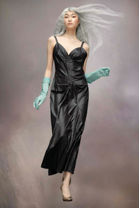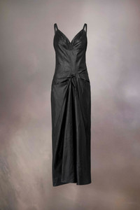 The maxi V-neck dress in poly moiré has a ruched neckline detailing to the hip. The low back is gathered and complete with slim straps. Maison Margiela's signature, the four stitches, appear at the back; the opposite of a label.