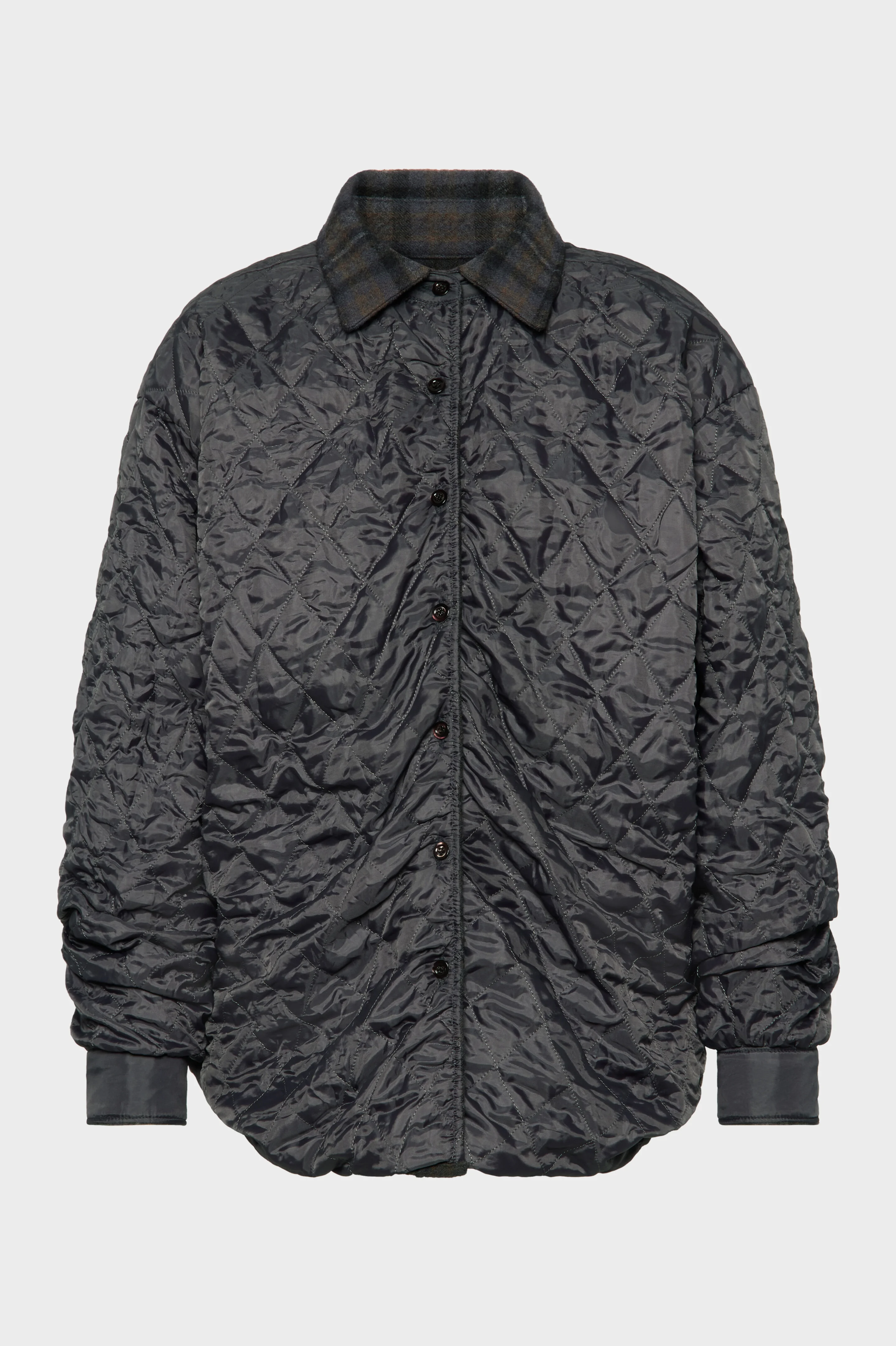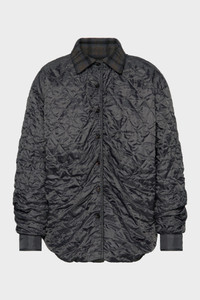 This reversible padded shirt-jacket is constructed with quilted panels that ripple across the surface. The checked wool collar evokes rural archetypes, while the padded volume offers both warmth and shape. Maison Margiela’s signature, the four stitches, appear at the back; the opposite of a label. Product Details Item ID S51DT0024MTN117860 Primary fabric: 100% virgin wool Lining: 100% polyester Wadding: 100% cotton Quilted overshirt with classic collar and curved hem Diamond-stitched outer with padded structure Button closure through the front Ruched sleeves with contrast cuffs Checked flannel lining at the collar Four stitches at the back Made in Italy