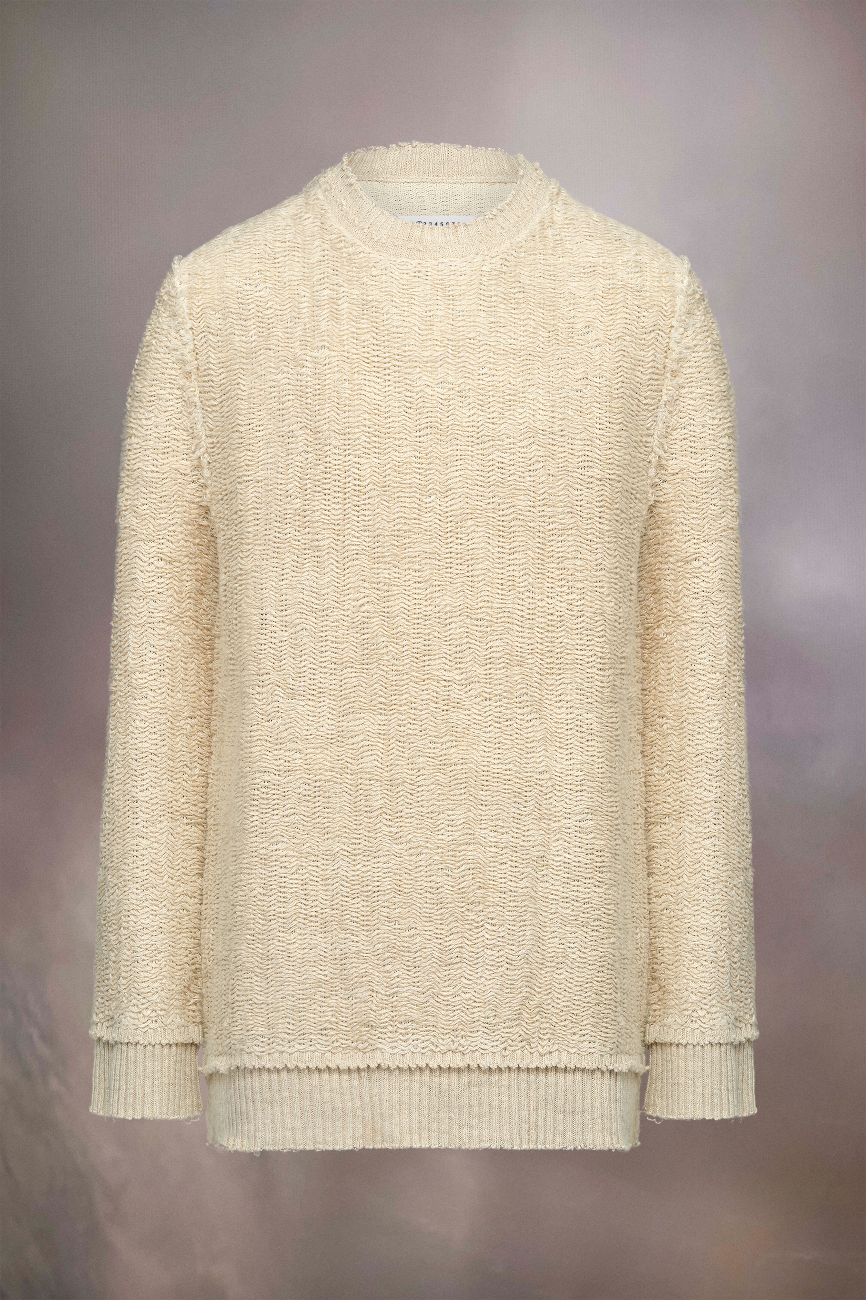In raw woven knit, this sweatshirt has an oversized fit and features distressed shoulder seams, neckline and cuffs with ribbed trims. Maison Margiela's signature, the four stitches, appear at the back; the opposite of a label. Gauge 7.
