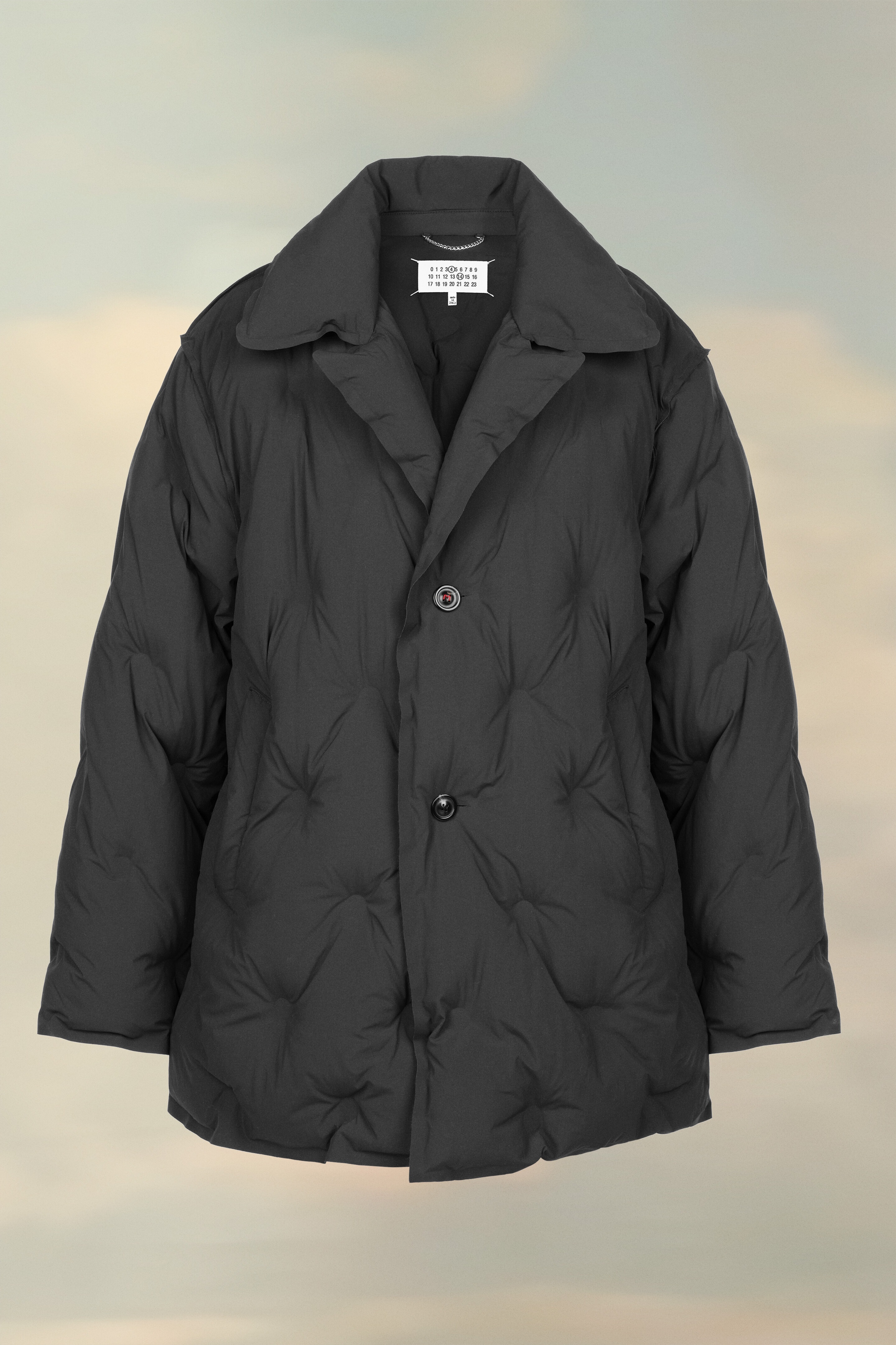 This padded coat comes in recycled nylon with the M button at the centre. It has a classic collar and side pockets. At the back yoke, the four white stitches show the hand of the Maison: the opposite of a label. Product Details Item ID SI1AM0003S54870900 Composition: 100% Nylon Lining: 100% Nylon Padding: 100% Polyester Quilted effect through heat sealing Single-breasted Dropped shoulder Two-button front closure Horn buttons with red M applications Slanted welt side pockets Four stitches at the back Made in Italy Oversized fit The model is 5'10" tall and wears size 46.