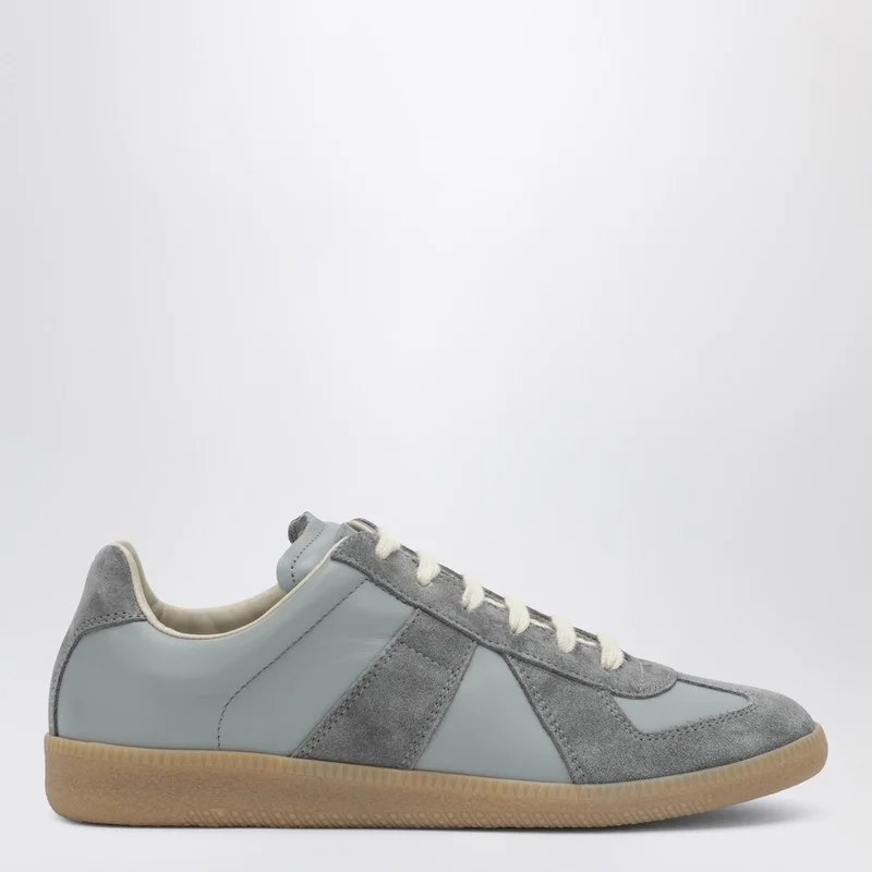 Maison Margiela sneakers in grey leather with light grey suede inserts, featuring a round toe, lace-up closure, logoed tongue, logo stitching on the back, and brown rubber sole.