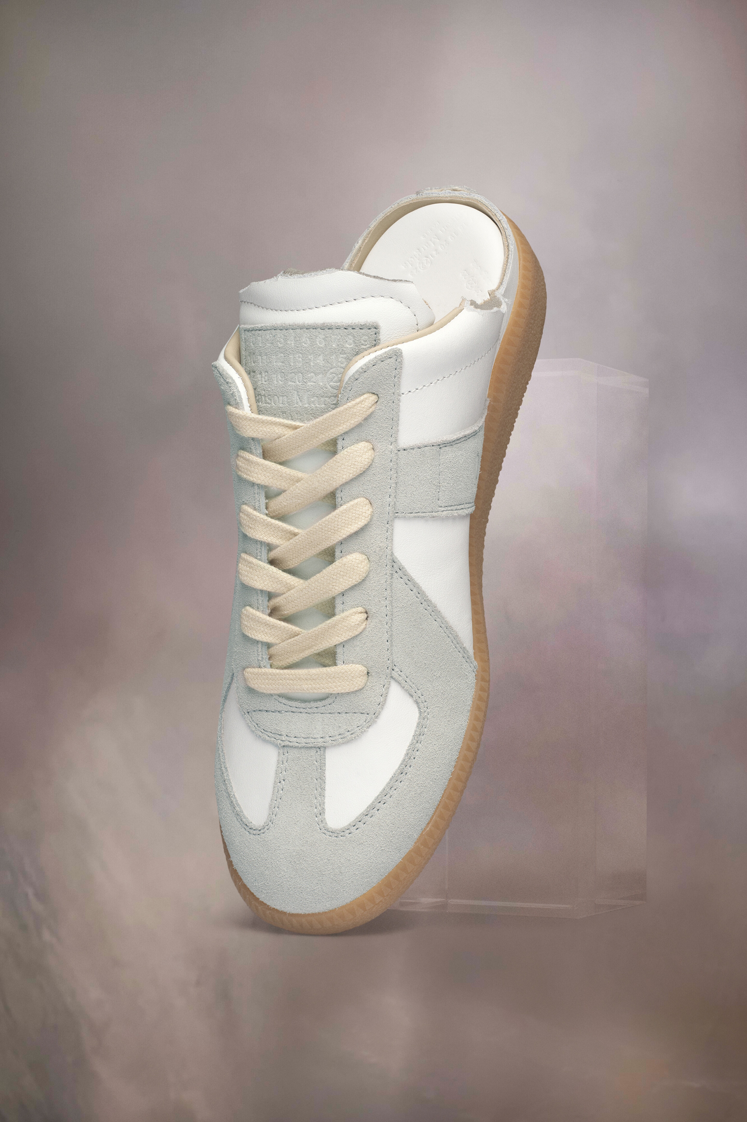 The Replica slip-ons in nappa leather and suede with a cut-away back, left raw for an unfinished aesthetic. They feature a paint drop design, created by hand. The Maison's Replica sneakers are inspired by Austrian sports shoes from the seventies. Details on the Replica pairs are continually reworked in line with the season's inspirations. Product Details Item ID S58WS0107P1895T1016