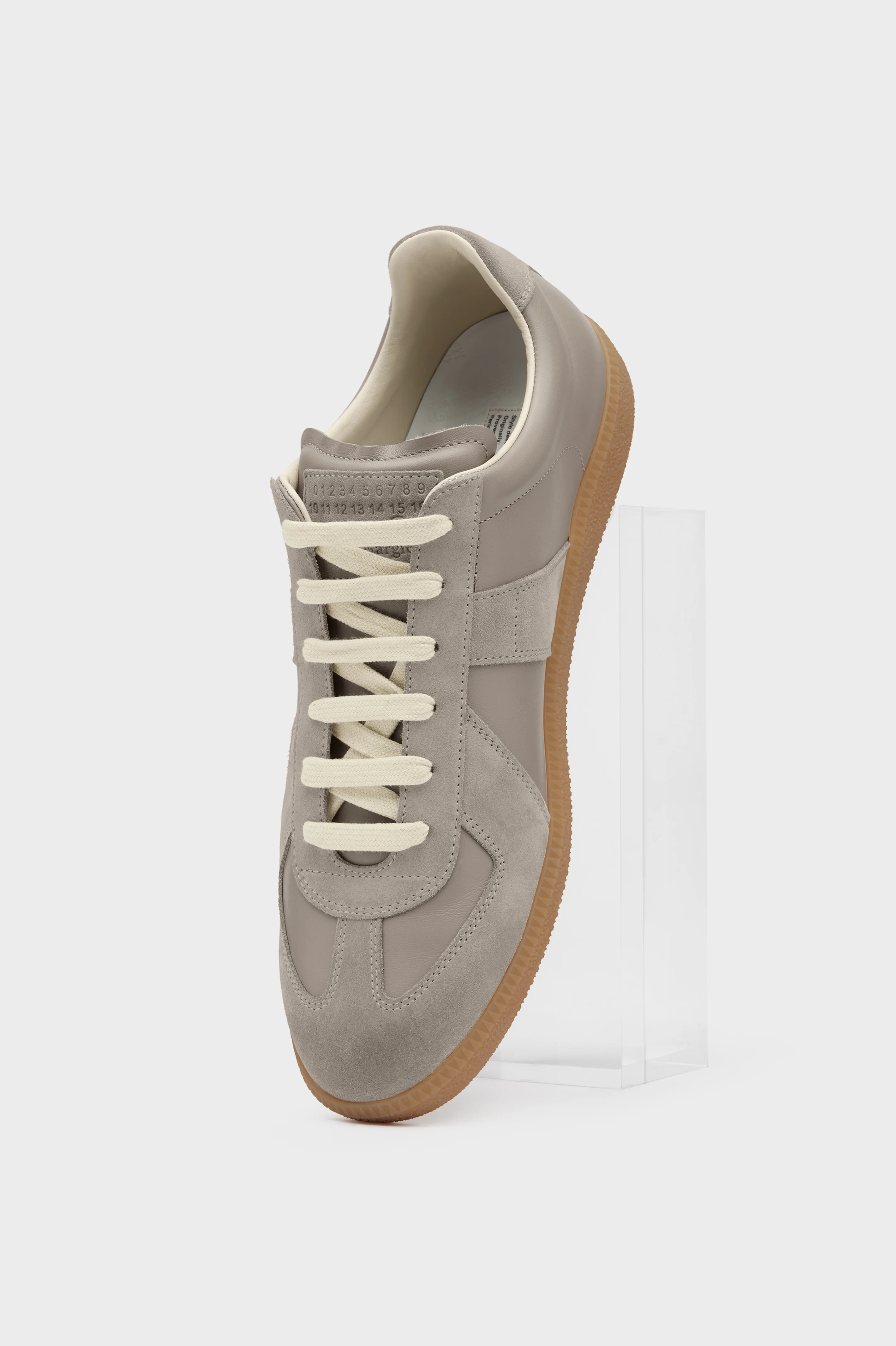 The Replica sneakers in nappa leather and suede with a honey sole. The Maison's iconic Replica sneakers are inspired by Austrian sports shoes from the seventies. Details on the Replica pairs are continually reworked in line with the season's inspirations. Product Details Item ID S58WS0109P1895T8046 Upper: 100% calf leather Contrast: 100% calf leather Lining: 100% cotton Inside: 100% calf leather Sole: 100% rubber Heel height: 3 cm Suede and nappa leather panels Lace-up closure Four stitches at the back Replica label on tongue Made in Italy
