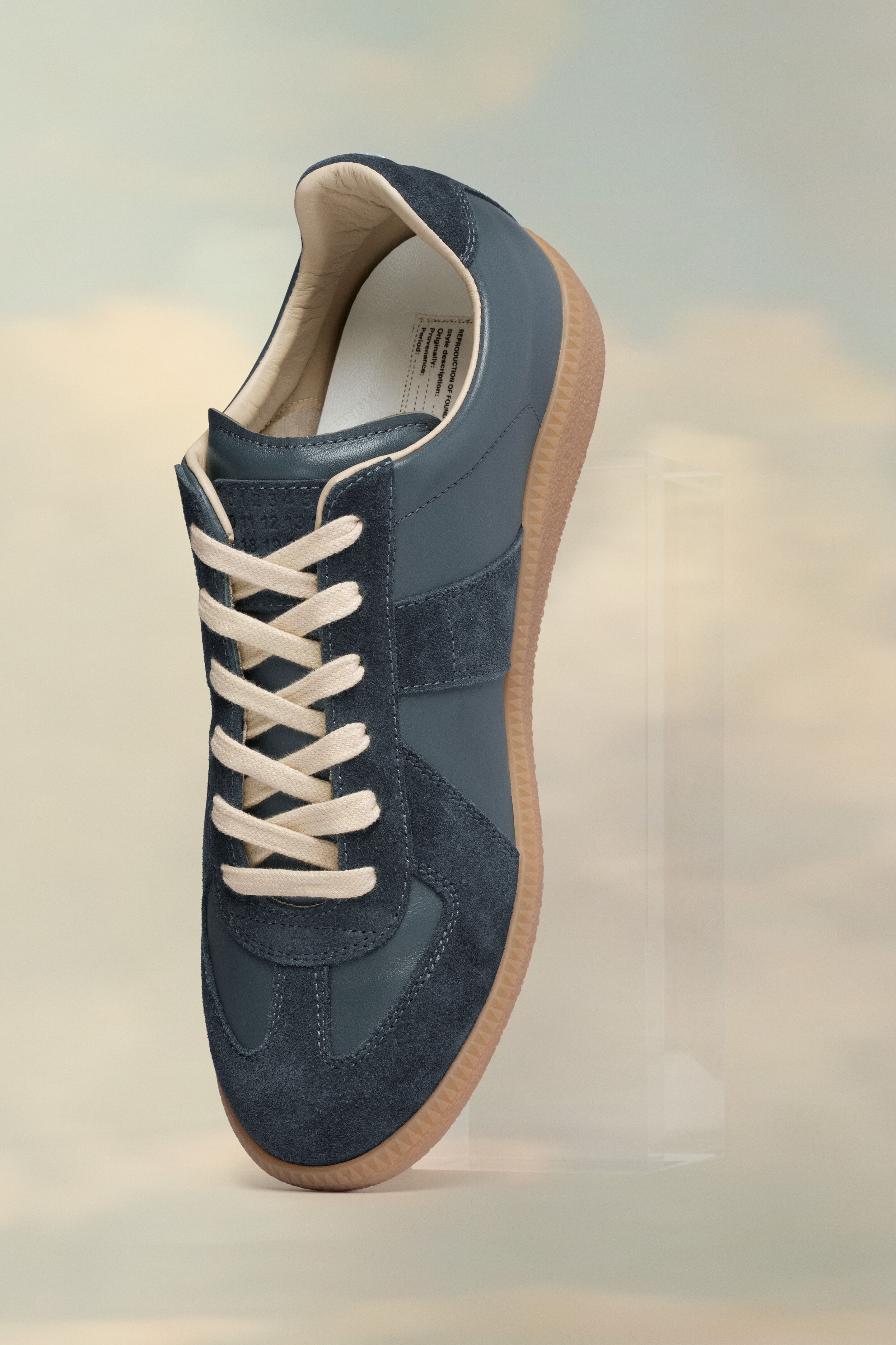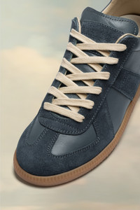 The Replica sneakers in nappa leather and suede with a honey sole. The Maison's iconic Replica sneakers are inspired by Austrian sports shoes from the seventies. Details on the Replica pairs are continually reworked in line with the season's inspirations.