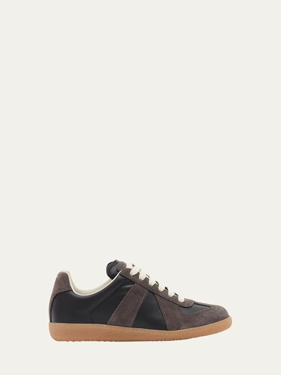 Maison Margiela "Replica" lowtop sneakers in twotone calfskin leather and suede. Flat heel. Round toe. Laceup vamp. Leather lining. Rubber sole. Made in Italy.