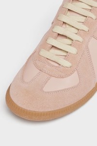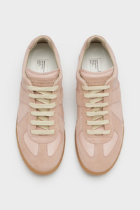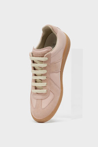 The Replica sneakers in nappa leather and suede with a honey sole. The Maison's iconic Replica sneakers are inspired by Austrian sports shoes from the seventies. Details on the Replica pairs are continually reworked in line with the season's inspirations. Product Details Item ID S58WS0109P1895T2563 Upper: 100% calf leather Contrast: 100% calf leather Lining: 100% cotton Inside: 100% calf leather Sole: 100% rubber Heel height: 3 cm Suede and nappa leather panels Lace-up closure Four stitches at the back Replica label on tongue Made in Italy