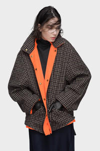A reversible jacket that shifts from checked wool heritage to high-vis Cordura utility. The Maison's Shrink to fit technique using a boiled wool layer subtly reshapes the silhouette. A piece designed for transitions – between inside and out, city and country. Maison Margiela’s signature, the four stitches, appear at the back; the opposite of a label. Product Details Item ID S51AM0506MTN090912 Primary fabric: 100% polyamide Coating: 100% resin Secondary fabric: 100% virgin wool Pocket lining: 100% cotton Application: 100% ovine leather Coated polyamide jacket with wool interior Reversible construction Square-cut collar with snap button detail Snap button closure at the front Flap pockets with snap buttons at the hips Vertical welt pockets at the chest Leather triangle reinforcements at pocket edges Four stitches at the back Made in Italy