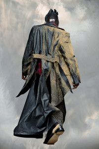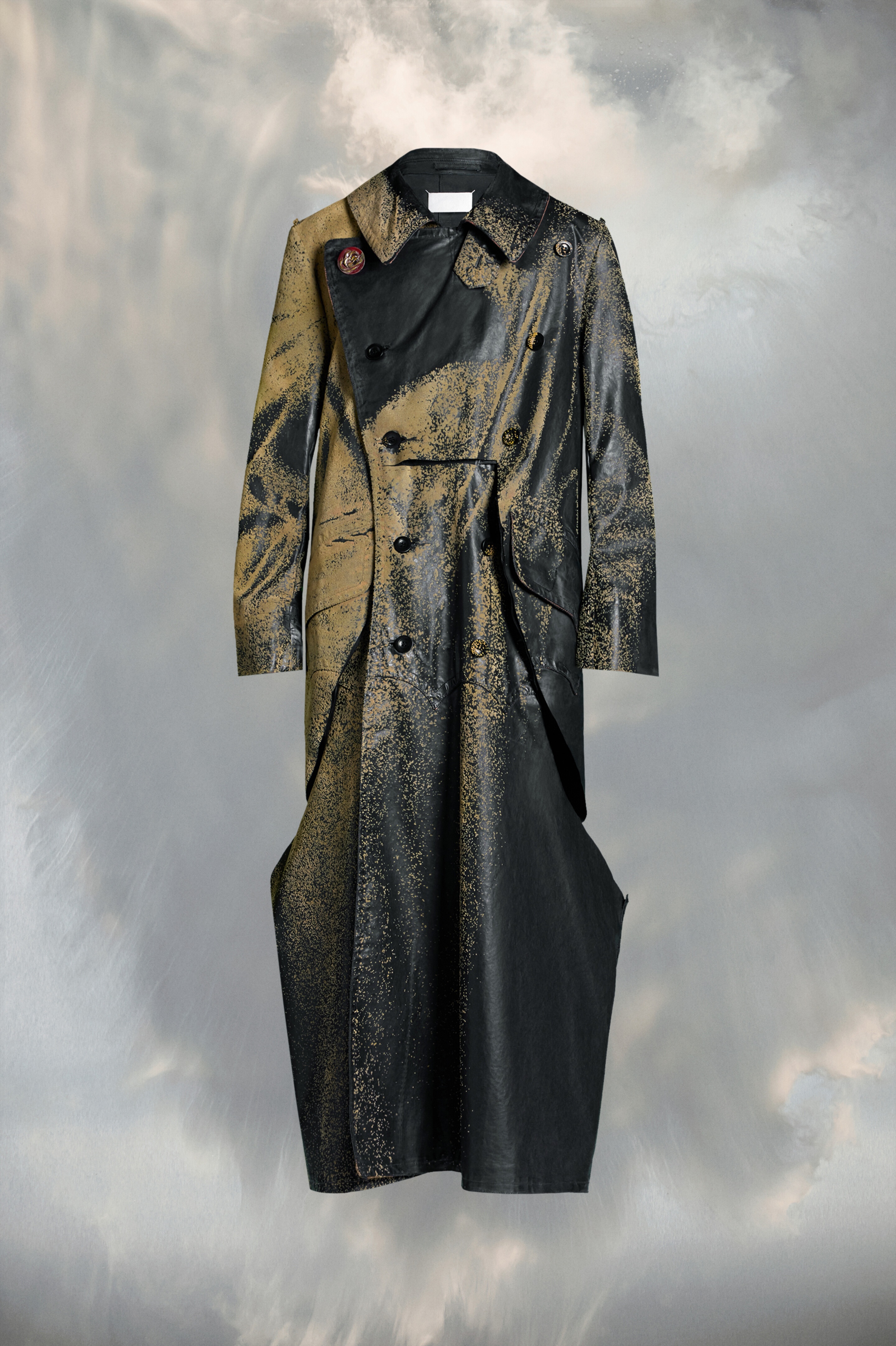 The coat in rubberized cotton is finished with Sandstorming, a technique which conjures the effect of a sandstorm on the fabric as surface decoration. The trench coat with cut-out sides and worn-out details, is double-breasted with a waistbelt and collar. A reference to the Maison Margiela Artisanal 2022 romantic tale that influenced this collection, set in the Arizona desert. Maison Margiela’s signature, the Four stitches, appear at the back; the opposite of a label. Product Details Item ID S29AH0172S48398900 COED Fall Winter 2023 Composition: 100% Rubberized cotton Coating: 100% Flocking Pocket lining: 100% Cotton Application: 100% Calf leather Double-breasted Sandstorm flocking Worn out details Cut out details Adjustable belt with leather buckle Flap pockets Four stitchesat the back Made in Italy Model is 6'2" tall and wears a size 40.