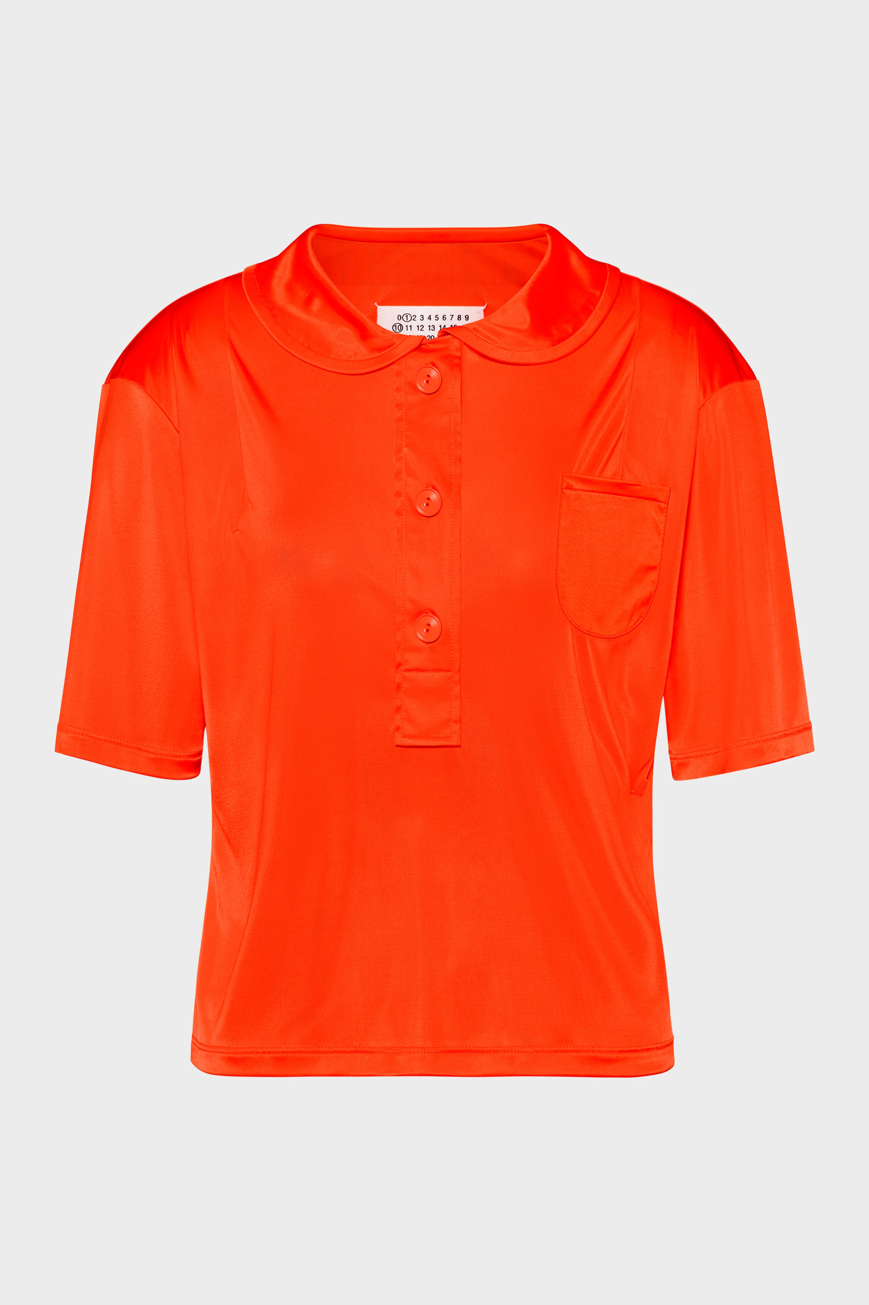 Reinterpreting a retro sports silhouette, this cropped shirt is crafted with a rounded collar, short sleeves, and tonal buttons. The compact cut adds a contemporary note, while subtle sheen enhances the fabric’s vivid hue. Maison Margiela’s signature, the four stitches, appear at the back; the opposite of a label. Product Details Item ID S51GL0060M20133311 Primary fabric: 100% viscose-rayon Short-sleeve shirt with a soft drape Rounded collar with tonal stitching Three-button placket at the front Chest patch pocket Straight hem Four stitches at the back Made in Italy