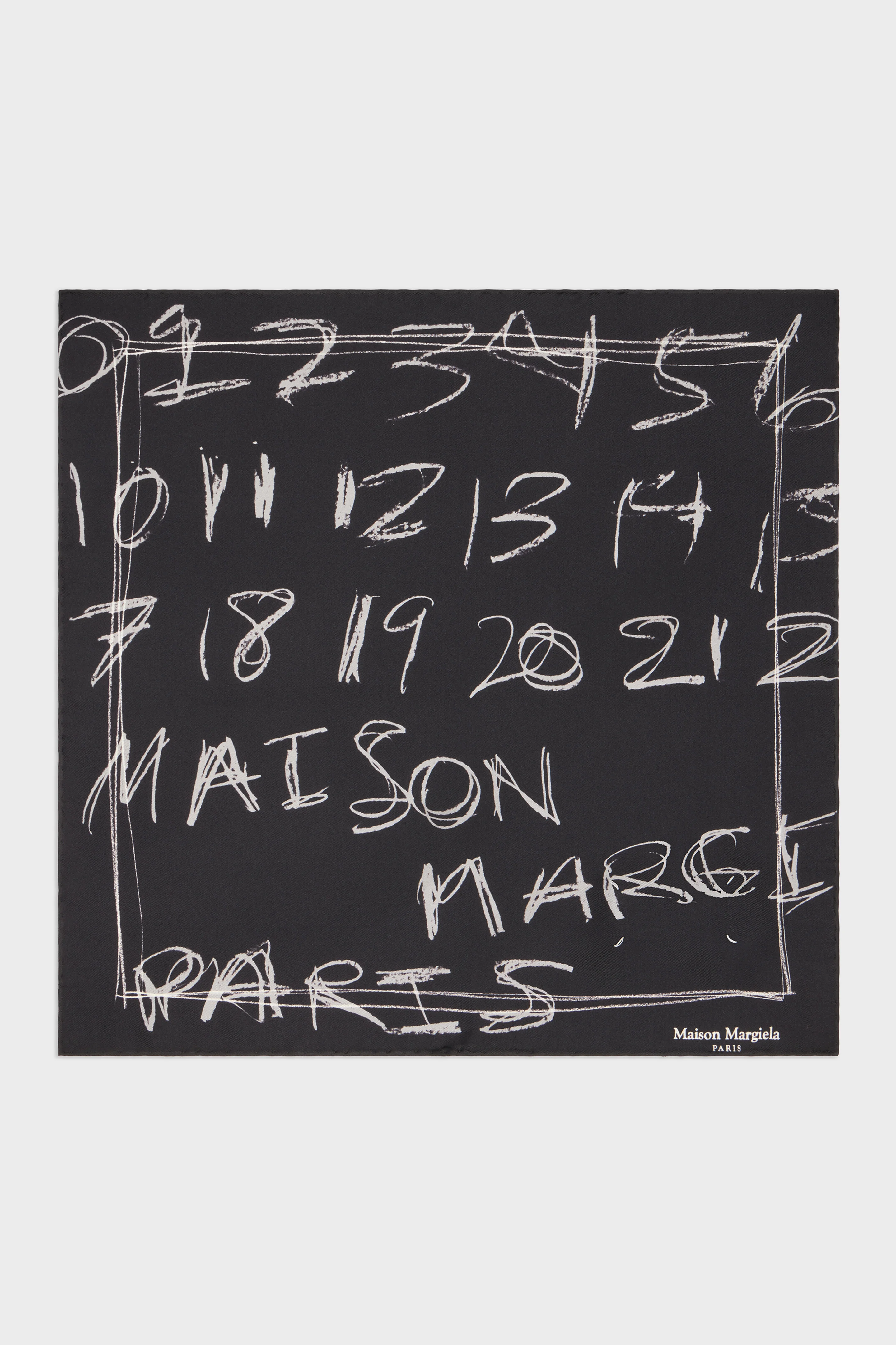 Maison Margiela translates its iconic numeric logo into an expressive foulard, rendered in silk with an oversized scribble effect. The sketch-like motif blurs permanence and impermanence, bringing a playful yet conceptual layer to a classic accessory. Product Details Item ID S51TF0048M35819900S Primary fabric: 100% silk Printed silk twill Scribble numbers motif Made in Italy
