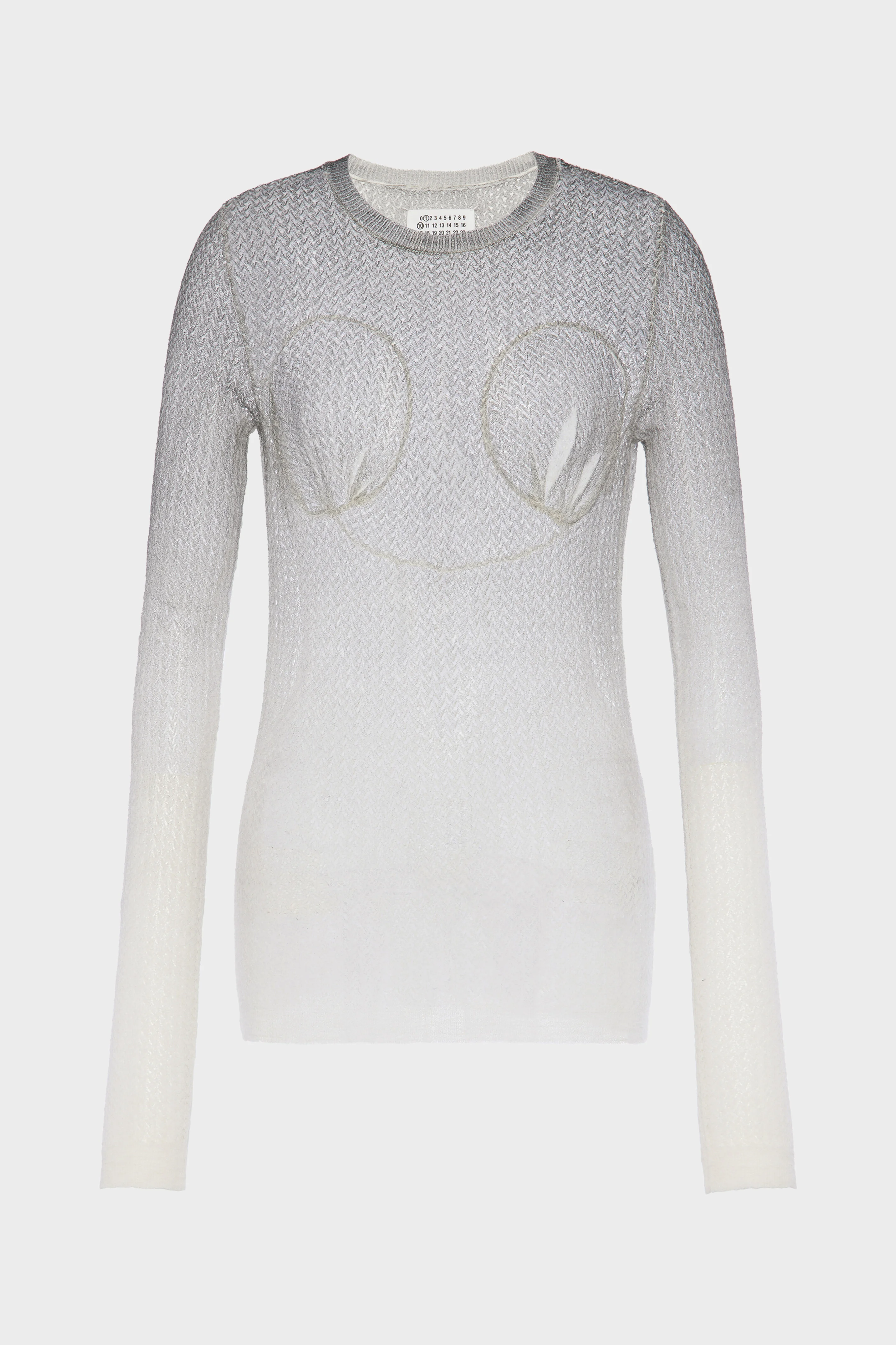 Maison Margiela explores transparency through this long-sleeve crewneck knit. Spun in a wool blend, its lightweight body transitions in tonal gradation, highlighting the interplay of opacity and form. Bust seams add subtle structure to the sheer surface. At the back, the Maison’s signature four stitches appear; the opposite of a label. Product Details Item ID S51HL0036M13231101S Primary fabric: 62% wool 26% acrylic 12% polyamide-nylon Gauge 14/sheer foiled Long sleeves Round neck Four stitches at the back
