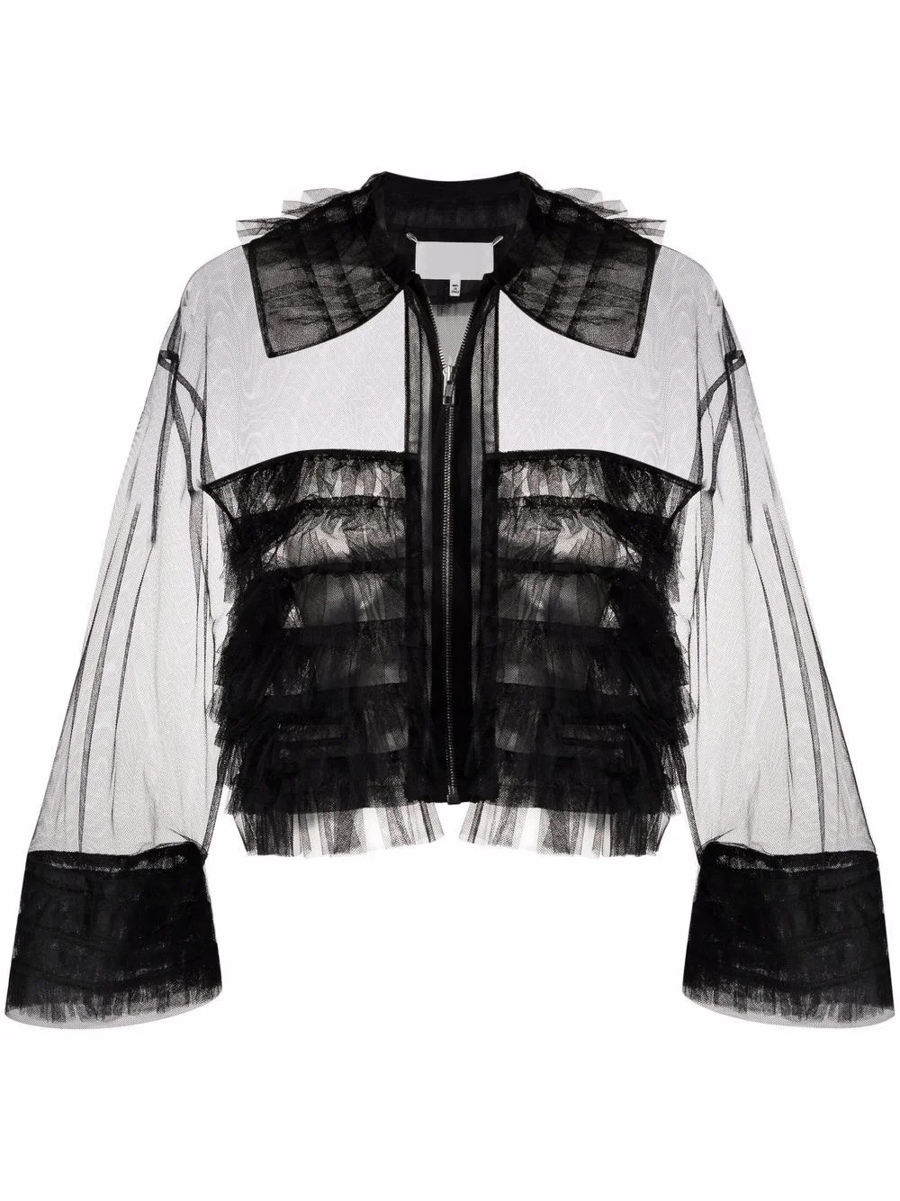 sheer tulle bomber jacket black tulle overlay ruffled detailing sheer classic collar front zip fastening wide sleeves cropped Made in Italy Composition Polyamide 100% SIZE & FIT Model measurements Height 5 ft 10 in(1.78 m) Bust/Chest 33.07 in(84 cm) Hips 35.82 in(91 cm) Waist 26.96 in(68.5 cm) FittingInformation This piece fits true to size. We recommend you get your regular size Cut for a loose fit Made with a lightweight fabric Washing instructions Dry Clean Only