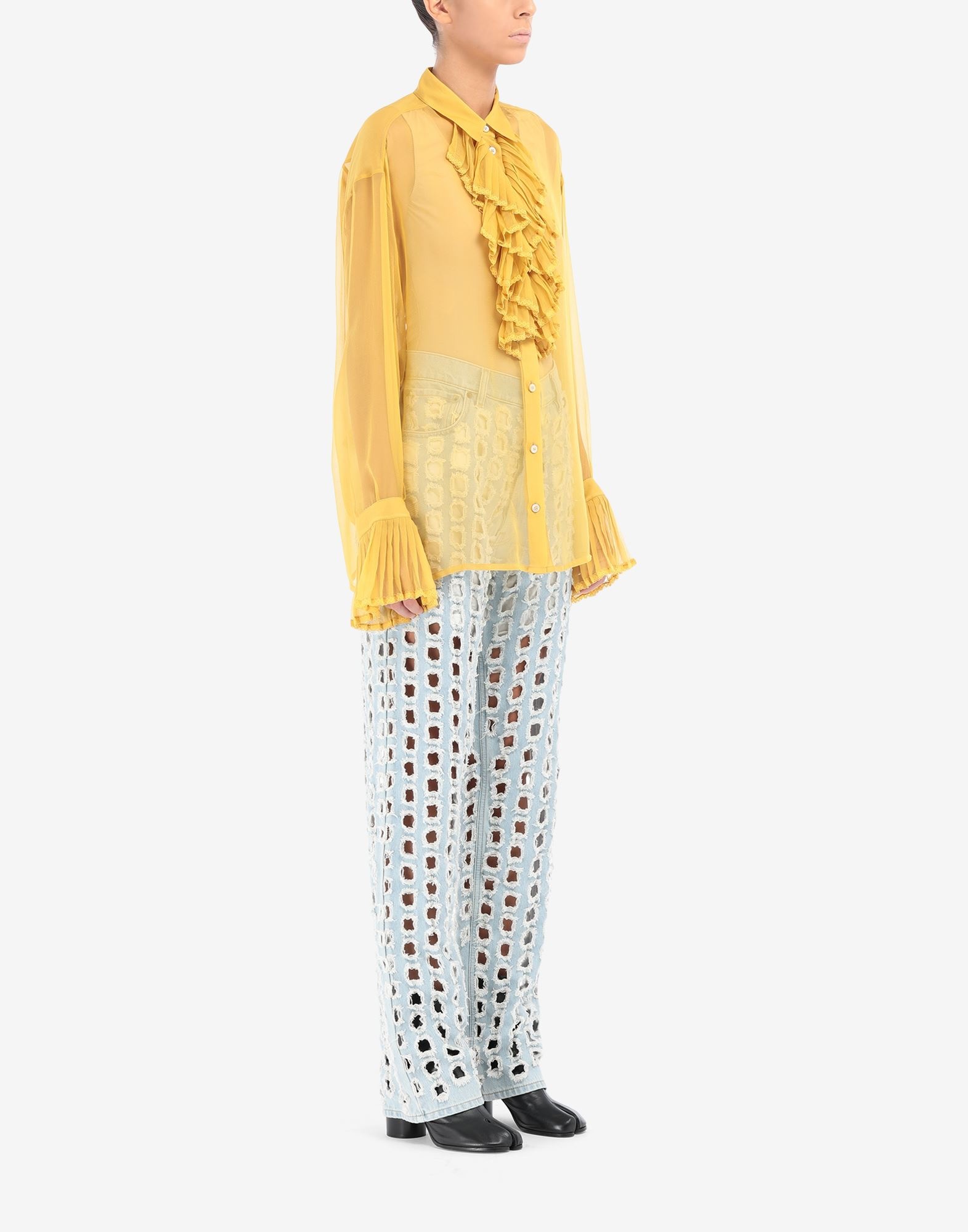Bourgeoisie style shirt in silk chiffon with statement pleated ruffles below the collar. Buttoned down the front, it has flared, pleated cuffs finished with laced hems. The white four-stitches moniker accents the back with a visible label. Made in Italy. Item details 100% Silk Ruffles Classic Neckline Long sleeves Button closing Chiffon Dual cuffs