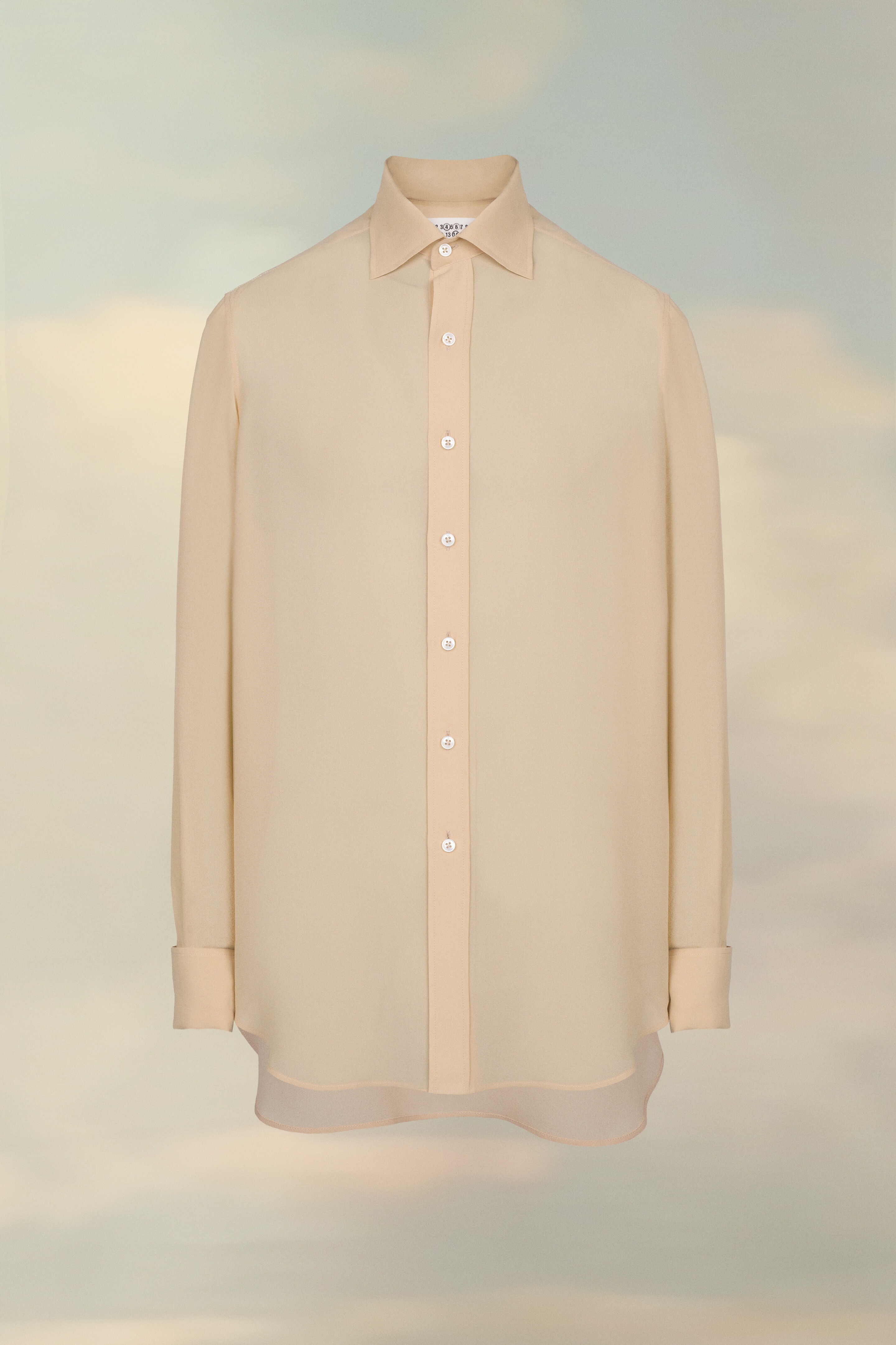 A classic shirt in silk georgette with a curved, dropped hem and buttoned placket. At the back, four white stitches show the hand of the Maison: the opposite of a label. Product Details Item ID SI0DL0003S60395121 Composition: 100% Silk Central botton closure Single-button cuffs Mother of pearl buttons Dropped shoulder Side slits Curved hem Four stitches at the back Made in Italy Oversized fit The model is 6'2" tall and wears size S.