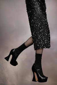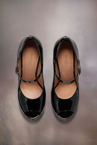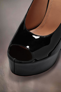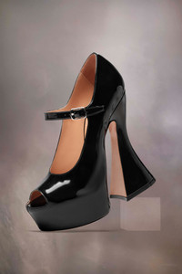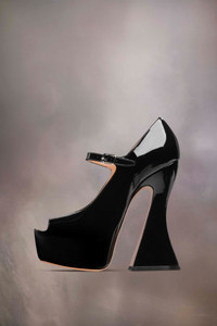 The sketch Mary-Jane shoes come in patent leather with an open toe design and extra-high statement flared heel. The back features a single white stitch showing the hand of Maison Margiela. Product Details Item ID S58WL0257P4347T8013 Upper: 100% calf leather Lining: 100% ovine leather Inside: 100% ovine leather Contrast: 100% calf leather Sole: 100% calf leather Contrast: 100% rubber Heel height: 15 cm/6 in Platform height: 4 cm/1,5 in Patent leather Mary Jane high pumps Open-toe Adjustable strap White stitching at the back Made in Italy A digital certificate provided by the Aura Blockchain Consortium guarantees the authenticity of this product. Discover more on auraluxuryblockchain.com/#about