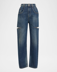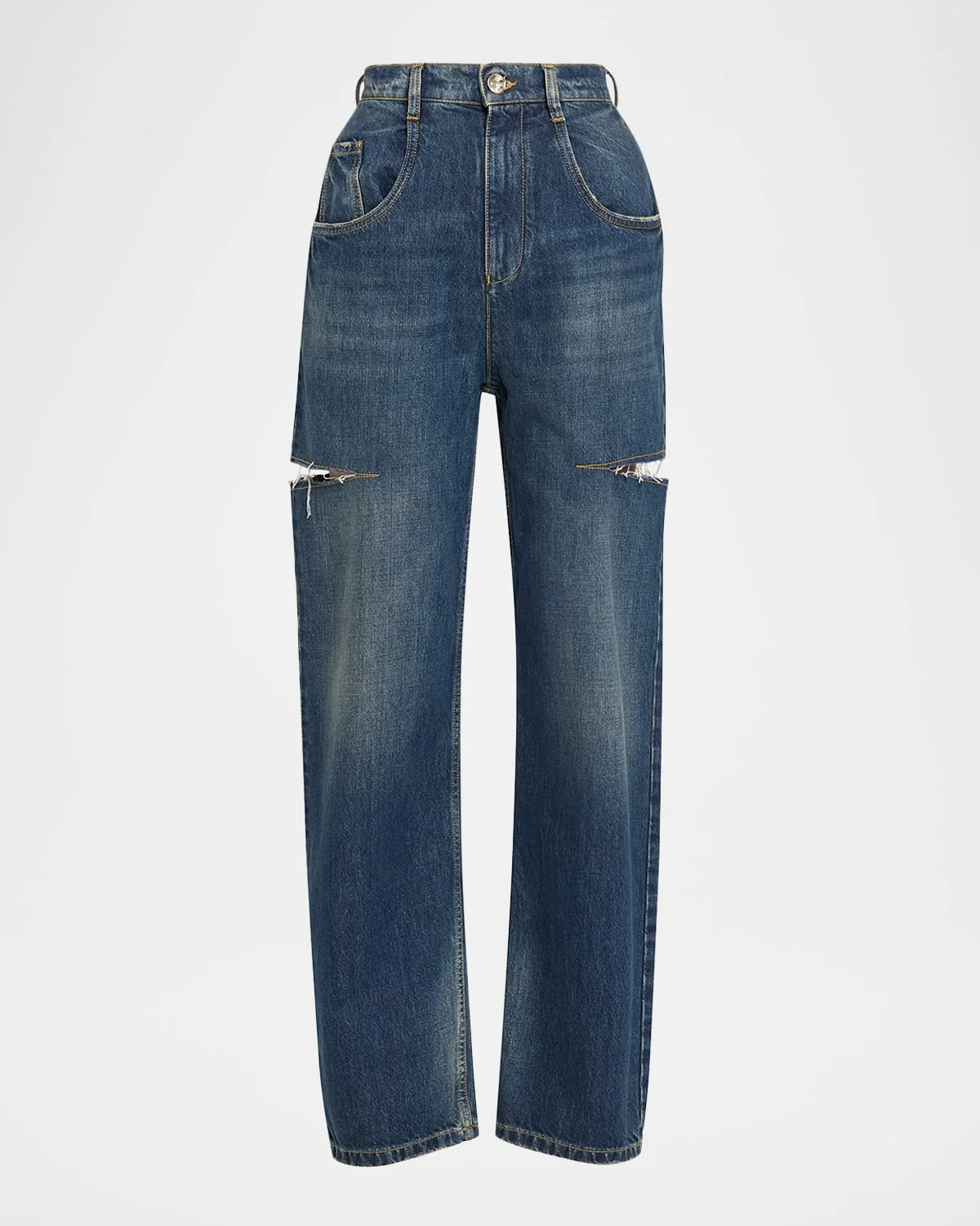 Maison Margiela jeans in faded mediumwash denim featuring thigh slash slits High waist Fivepocket style Curved barrel legs Full length Button/zip fly; belt loops Cotton Machine wash cold Made in Italy