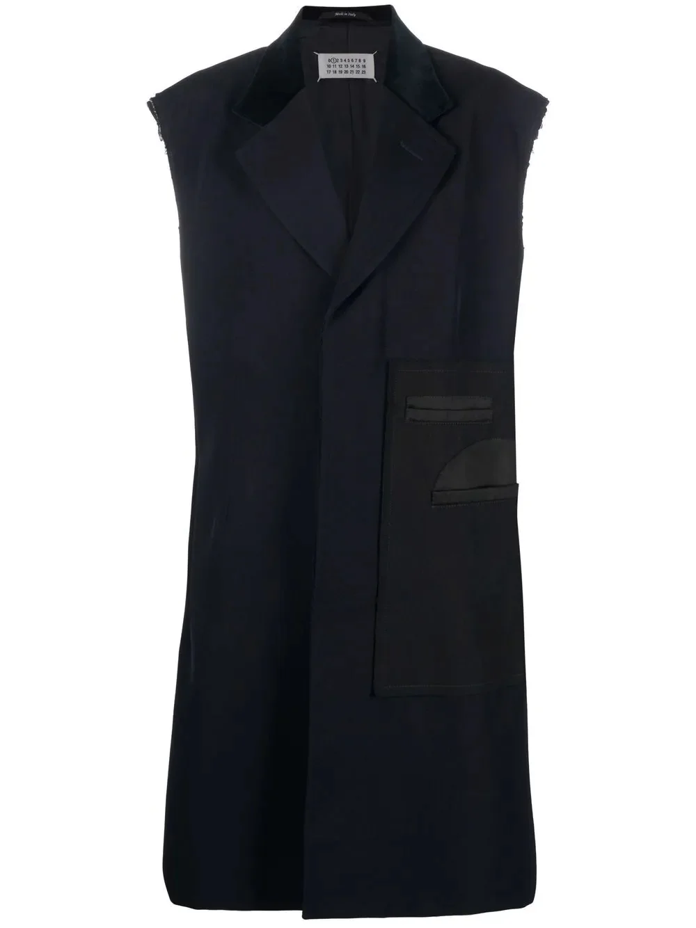 sleeveless raw-cut coat A sense of uniqueness runs through Maison Margiela’s visual identity, with deconstructed silhouettes and bold designs defining the label’s aesthetic. A fine example of that, this sleeveless coat showcases contrasting panel details and a raw-cut finish. Made in Italy Composition Outer: Cotton 100%, Polyester 54%, Wool 23%, Virgin Wool 21%, Spandex/Elastane 2% Lining: Cotton 100%, Viscose 100% SIZE & FIT Model measurements Height 5 ft 11 in(1.8 m) Bust/Chest 31.49 in(80 cm) Hips 35.82 in(91 cm) Waist 24.8 in(63 cm) FittingInformation This piece fits true to size. We recommend you get your regular size Cut for a loose fit Made with a mid-weight fabric Washing instructions Dry Clean Only
