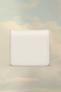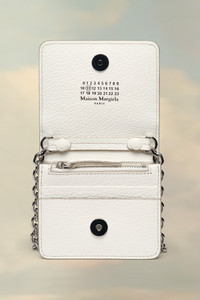 Small wallet in grainy, embossed leather attached to a removable chain strap. It features a zipped inner compartment and back compartment with the number logo inside. Signature four-stitches on the outside. Made in Italy.