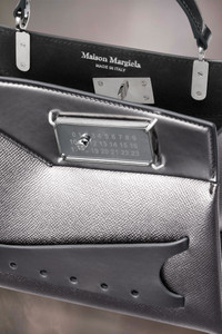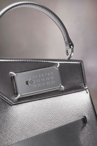 The small Snatched handbag is crafted from metallised grainy leather with contrast smooth detail. The Snatched debuted in the AW19 Artisanal Collection. It lends its name from the colloquial term for 'good looks', and also the way it can be held in a snatching manner. The genderless bag presents an asymmetric shape, inspired by origami. It features a top handle, and a perforated front handle to be worn as a clutch. The bag introduces the Maison's rectangular mirrored lock closure, adorned with the numeric logo that unlocks on number 11. Product Details Item ID S56WG0168P7247H3809