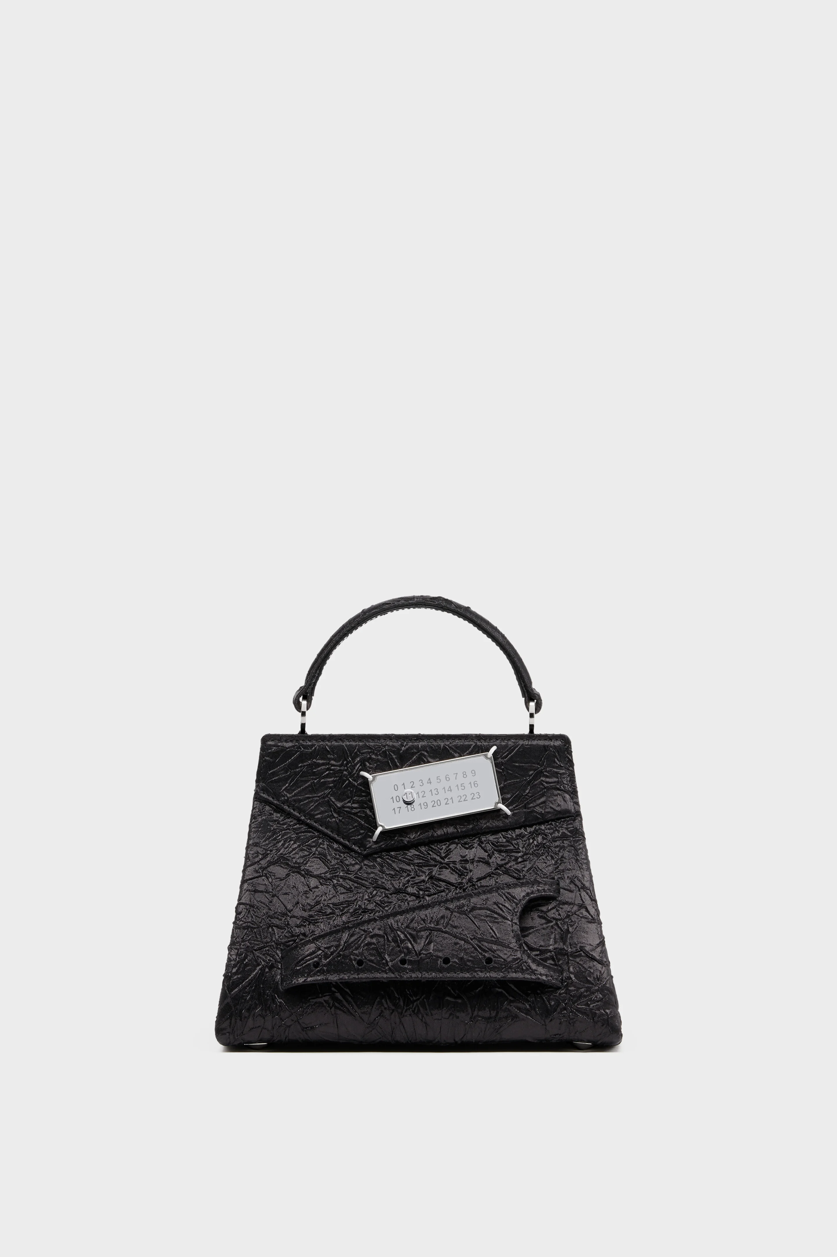 The Snatched handbag small is crafted from a textural fabrication, with a patent, metallized finish to emphasise the wrinkles. The Snatched debuted in the AW19 Artisanal Collection. It lends its name from the colloquial term for 'good looks', and also the way it can be held in a snatching manner. The genderless bag presents an asymmetric shape, inspired by origami. It features a leather shoulder strap, and a perforated front handle to be worn as a clutch. The bag introduces the Maison's rectangular mirrored lock closure, adorned with the numeric logo that unlocks on number 11. Product Details Item ID S56WG0168P8272H8588 Body: 100% Polyester Contrast: 100% Calf Leather Inside: 100% Calf Leather Lining: 100% Polyester Metallic hardware Handbag in crinkled lame fabric Detachable and adjustable leather shoulder strap Top handle Front logo closure Front handle Inside flat pocket Inside logo stamping Metal feet Clean with a gentle cleaner Made in Italy