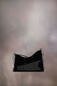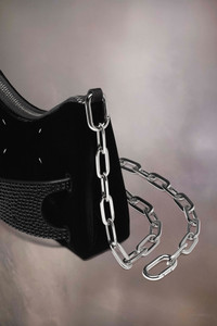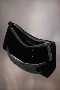 The Snatched hobo micro is crafted from velvet with rhinestone embellishment. The Snatched debuted in the AW19 Artisanal Collection. It lends its name from the colloquial term for 'good looks', and also the way it can be held in a snatching manner. The genderless bag presents an asymmetric shape, inspired by origami. It features a shoulder strap, and a perforated front handle to be worn as a clutch. The bag introduces the Maison's rectangular mirrored lock closure, adorned with the numeric logo that unlocks on number 11. Product Details Item ID SB1WG0055P6427T8013 Body: 65% viscose-rayon, 35% cupro Application: 100% crystal Lining: 100% goat leather Metallic hardware Velvet and rhinestones hand bag Detachable and adjustable chain shoulder strap Front handle with rhinestones Four stitches at the front Zip closure Inside logo stamping Inside flat pocket Made in Italy 13,5 cm x 5 cm x 18,5 cm/5,3 in x 2 in x 7,3 in (Height x Width x Length) Max. shoulder strap drop: 57 cm/22,4 in Min. shoulder strap drop: 47 cm/18,5 in A digital certificate provided by the Aura Blockchain Consortium guarantees the authenticity of this product. Discover more on auraluxuryblockchain.com/#about Model is 178cm tall.