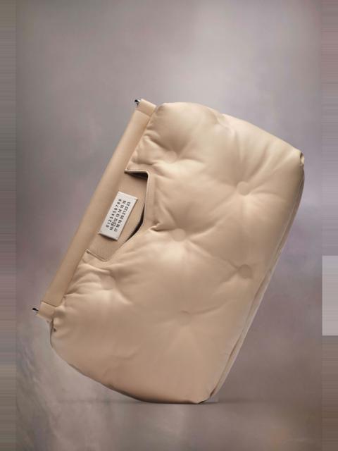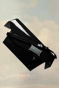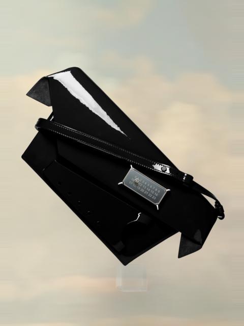 The medium-sized Snatched bag is crafted from leather. The Snatched debuted in the AW19 Artisanal Collection. It lends its name from the colloquial term for 'good looks', and also the way it can be held in a snatching manner. The genderless bag presents an asymmetric shape, inspired by origami. It features a detachable cross-body tonal shoulder strap, and a perforated front handle to be worn as a clutch. The bag introduces the Maison's new rectangular mirrored lock closure, adorned with the numerical logo that unlocks on number 11. The model is 187cm tall.