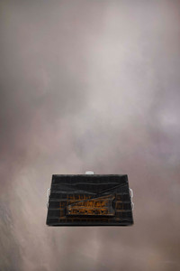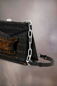 The small Snatched shoulder bag clutch is crafted from croc print leather with contrast colour to the front. The Snatched debuted in the AW19 Artisanal Collection. It lends its name from the colloquial term for 'good looks', and also the way it can be held in a snatching manner. The genderless bag presents an asymmetric shape, inspired by origami. It features a chain strap, and a perforated front handle to be worn as a clutch. Product Details Item ID SB1WD0028P7266HA783 Body: 100% Calf Leather Contrast: 100% Calf Leather Inside: 100% Calf Leather Inside: 100% Calf Leather Lining: 100% Polyester Metallic hardware Handbag in grainy leather Adjustable leather shoulder strap Front handle Inside flat pocket Inside logo stamping Metal feet Made in Italy