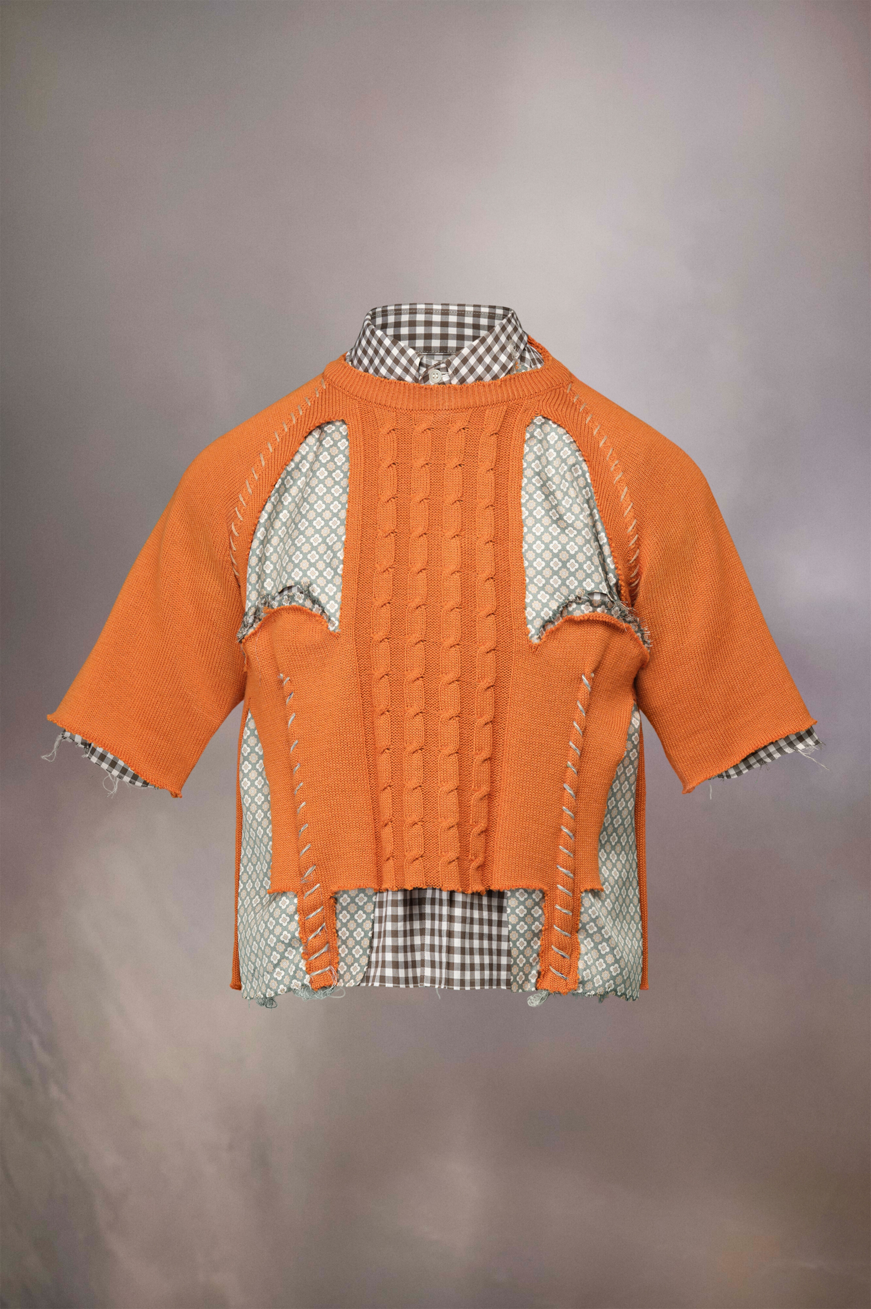 Exploring the Maison's spliced design code, the gingham check shirt has a distressed knit overlay, with short sleeves, cut-out details and work-in-progress stitch details for a patchwork, unfinished aesthetic. Maison Margiela's signature, the four stitches, appear at the back; the opposite of a label. The model is 178CM tall. Model wears size 46.