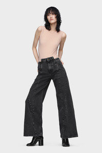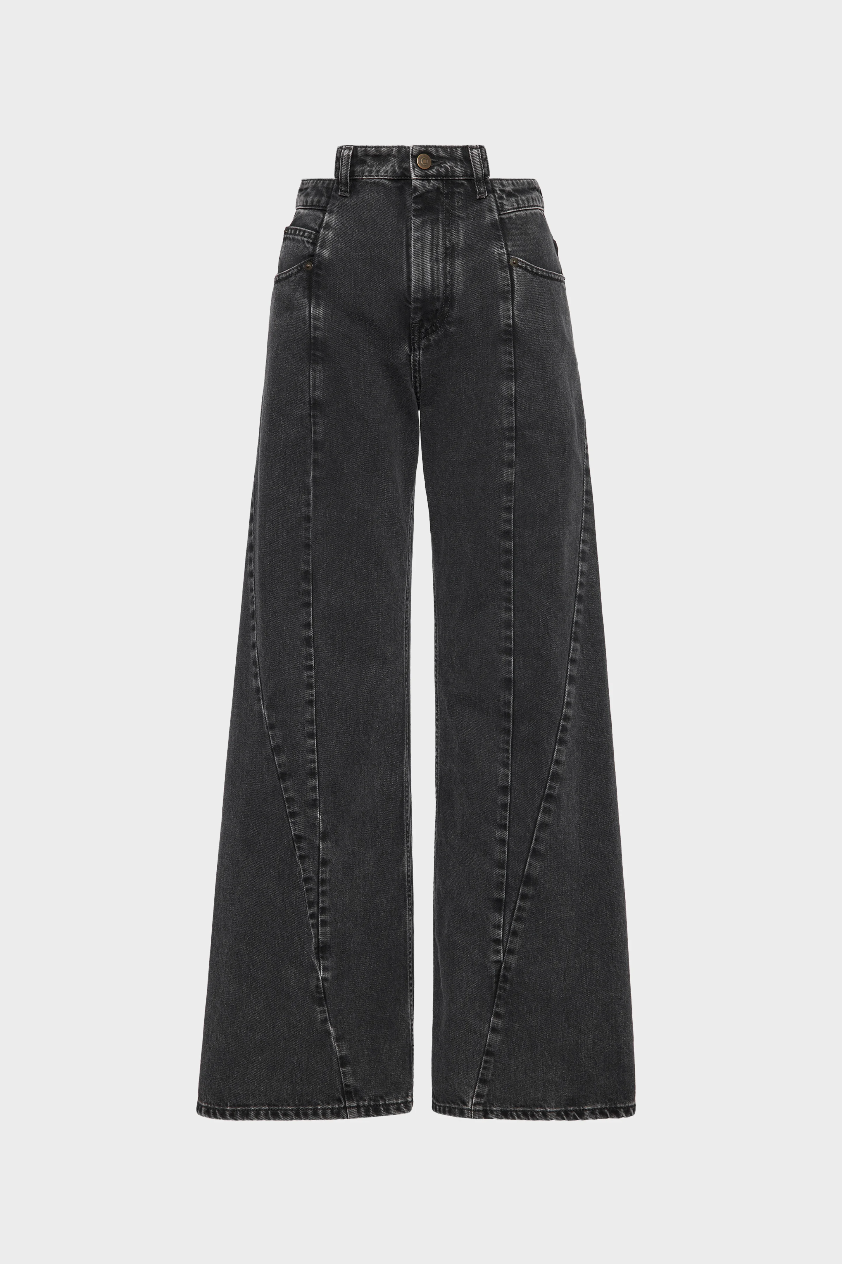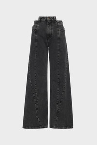 These spliced denim jeans challenge traditional denim with an unconventional, sculptural design. Geometric seams create dynamic tension and movement, while the high-waisted, wide-leg silhouette introduces a contemporary edge. The cut-out waist further elevates the deconstructed aesthetic, making these jeans a statement piece that fuses function with artistic expression. Product Details Item ID S51LA0133S30496961 Primary Fabric: 100% Cotton Pocket Lining: 100% Cotton Wide-leg jeans in washed cotton denim Curved seam panels along the front High-rise waist with belt loops Cut-out detail to the waist Zip fly and button fastening Made in Italy