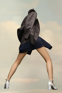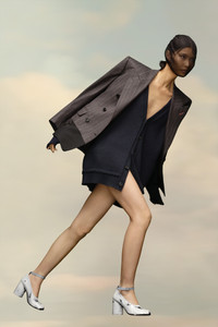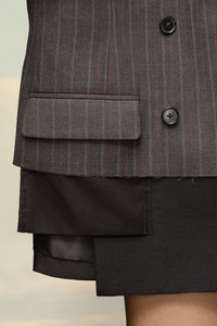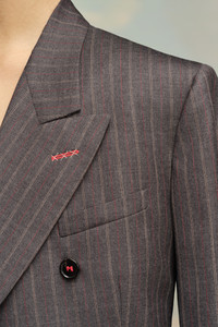 Crafted from pinstripe wool, spliced on top of a work-in-progress garment, this double-breasted blazer features memory of cuffs. At the back, four white stitches show the hand of the Maison: the opposite of a label. The model is 180cm tall. Model wears size 40.