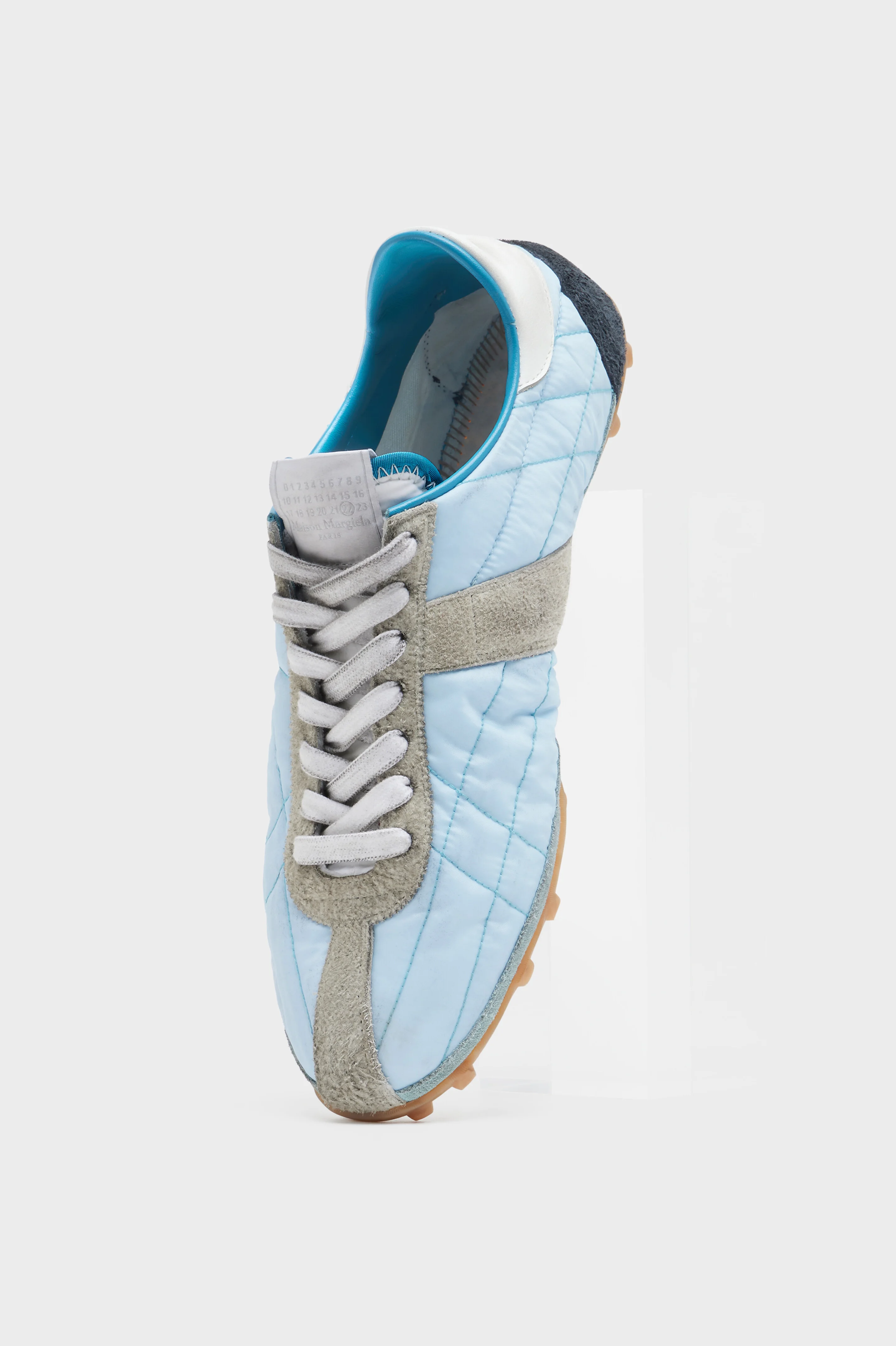 The Sprinters revisit 1960s spike shoes with a vintage-treated finish and exaggerated tactility. Crafted in hairy suede and calfskin, the design recalls town and countryside staples with quilted panels and a bold heel tab. The cleated sole includes numeric detailing, with 22 circled to indicate the Maison’s footwear collection. The tongue bears the numeric logo, while Maison Margiela’s signature single white stitch appears at the back. Product Details Item ID S58WS0272P7415HB057 Upper: 100% Polyester Contrast: 100% Calf Leather Contrast: 100% Calf Leather Lining: 100% Cotton Contrast: 100% Calf Leather Inside: 100% Calf Leather Sole: 100% Rubber Low-top sneakers with quilted exterior Suede calf leather trims and overlays Gum rubber sole with grip tread Numeric signature label at the tongue White stitching at the back Made in Italy
