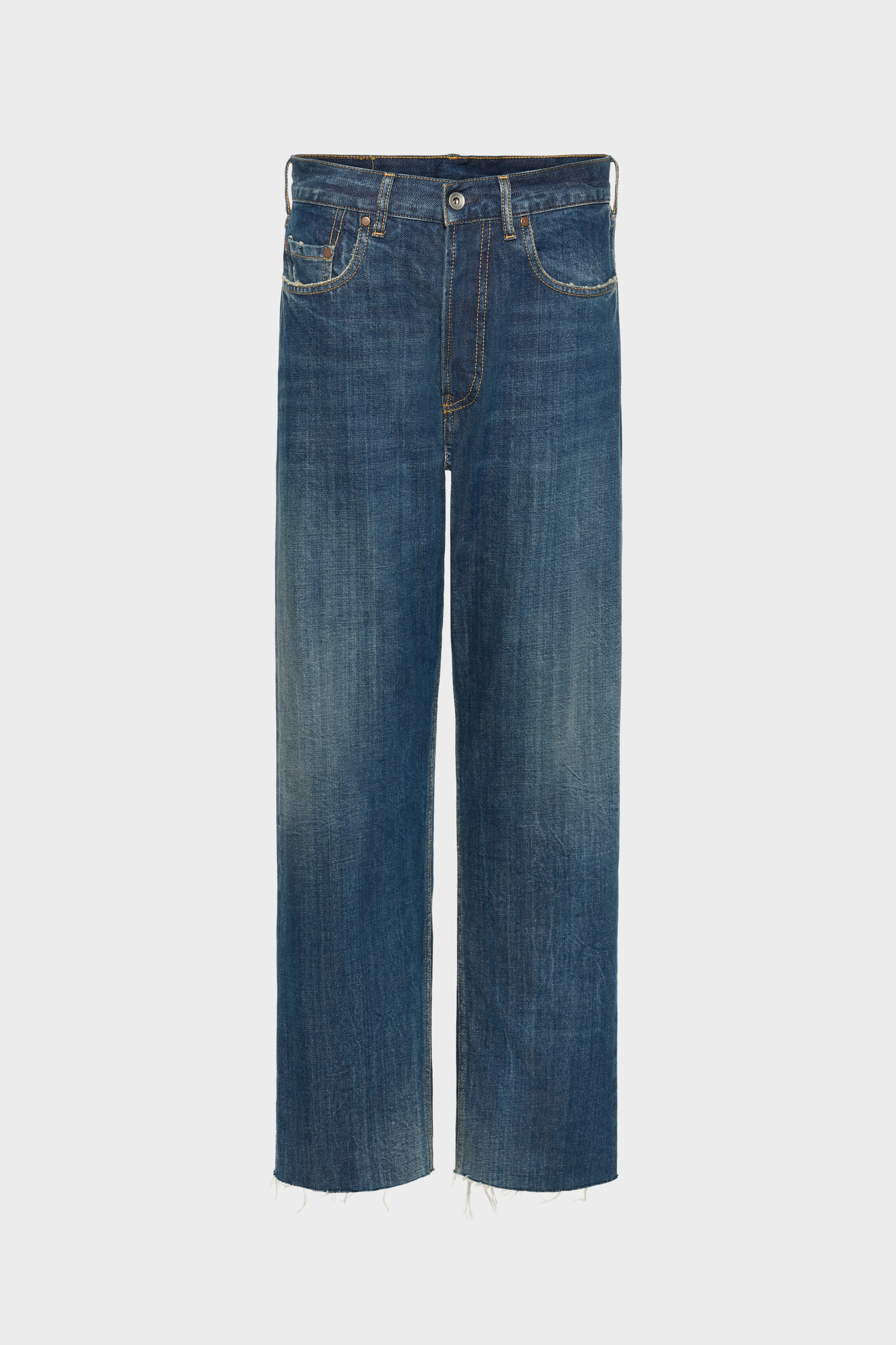 These straight-leg jeans are cut from washed denim with a worn-in finish and lightly distressed detailing. Classic five-pocket styling and contrast topstitching underscore the utilitarian construction, while the raw cuffs add a deconstructed feel. At the back, a memory of the jacron patch remains, together with the Maison’s signature four stitches; the opposite of a label. Product Details Item ID S29LA0101M30037961 Primary Fabric: 100% Cotton Pocket Lining: 65% Polyester, 35% Cotton Straight-leg jeans in washed denim Mid-rise waist with belt loops and button fastening Five-pocket construction Raw edges at the cuffs Made in Italy