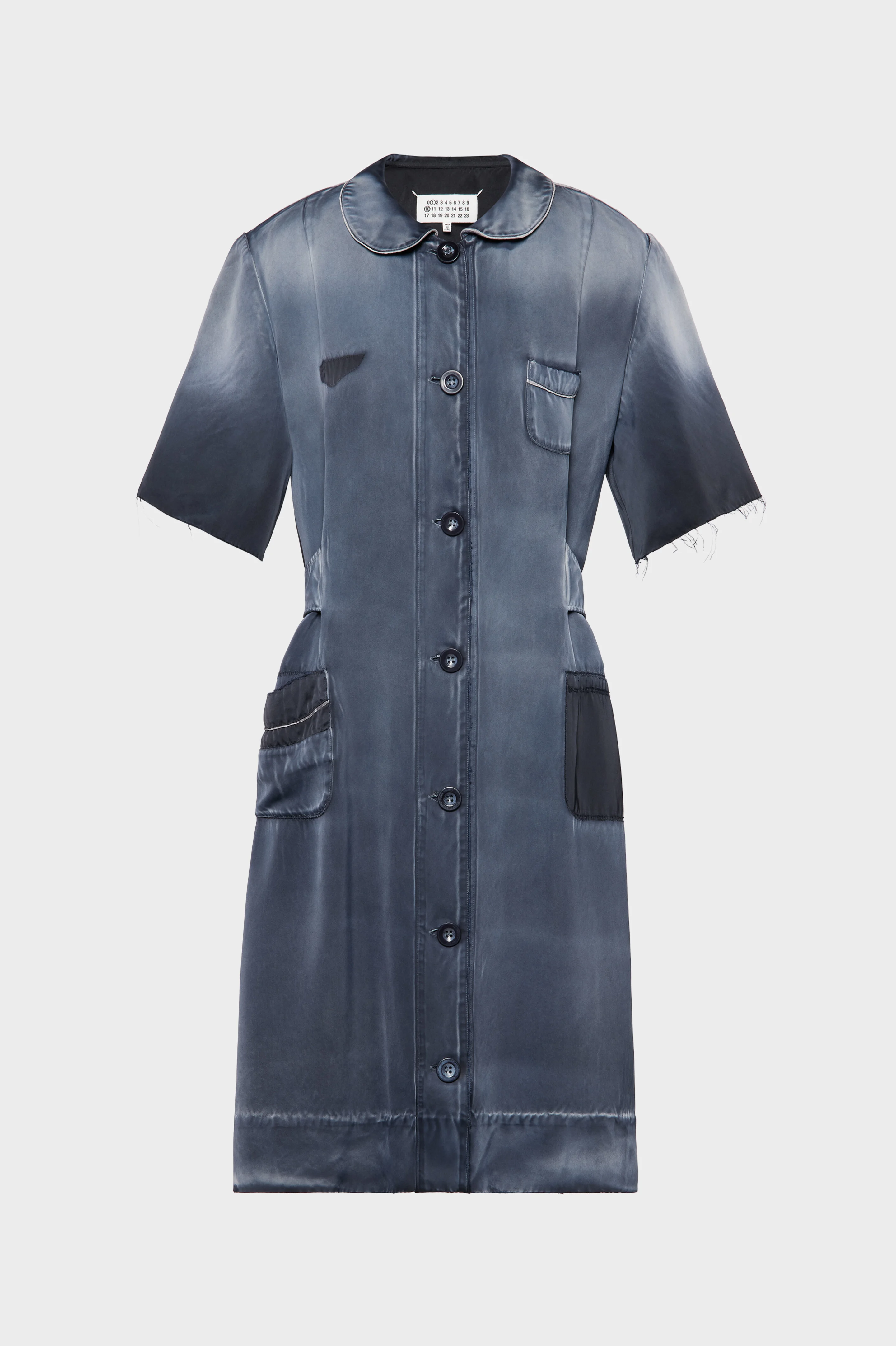 This dress is crafted using Maison Margiela’s sun-faded technique, designed to replicate the natural wear of garments exposed to light over time. Tonal fading and subtle irregularities give it a lived-in appearance, while contrast detailing highlights its deconstructed construction. Maison Margiela’s signature, the four stitches, appear at the back; the opposite of a label. Product Details Item ID S51DD0047M35389961 Primary fabric: 100% viscose Short-sleeved shirt dress with sun-faded finish Peter Pan collar with contrast piping Button closure through the front Patch pockets at the chest and hips Frayed sleeve edges Four stitches at the back Made in Italy