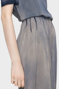 Drawing from real workwear pieces, this skirt is finished with a vintage wash that mimics the patina of sun exposure. A softly gathered silhouette and raw edges reference the Maison’s Memory of the Hem technique, highlighting traces of past construction. Maison Margiela’s signature, the four stitches, appear at the back; the opposite of a label. Product Details Item ID S51ME0046M13155001F Primary Fabric: 100% Viscose-Rayon Midi skirt in sun-faded technique High-rise waist with softly gathered pleats Lightweight silhouette with dip-dyed hem Raw-edge finish along the hemline Four stitches at the back Made in Italy