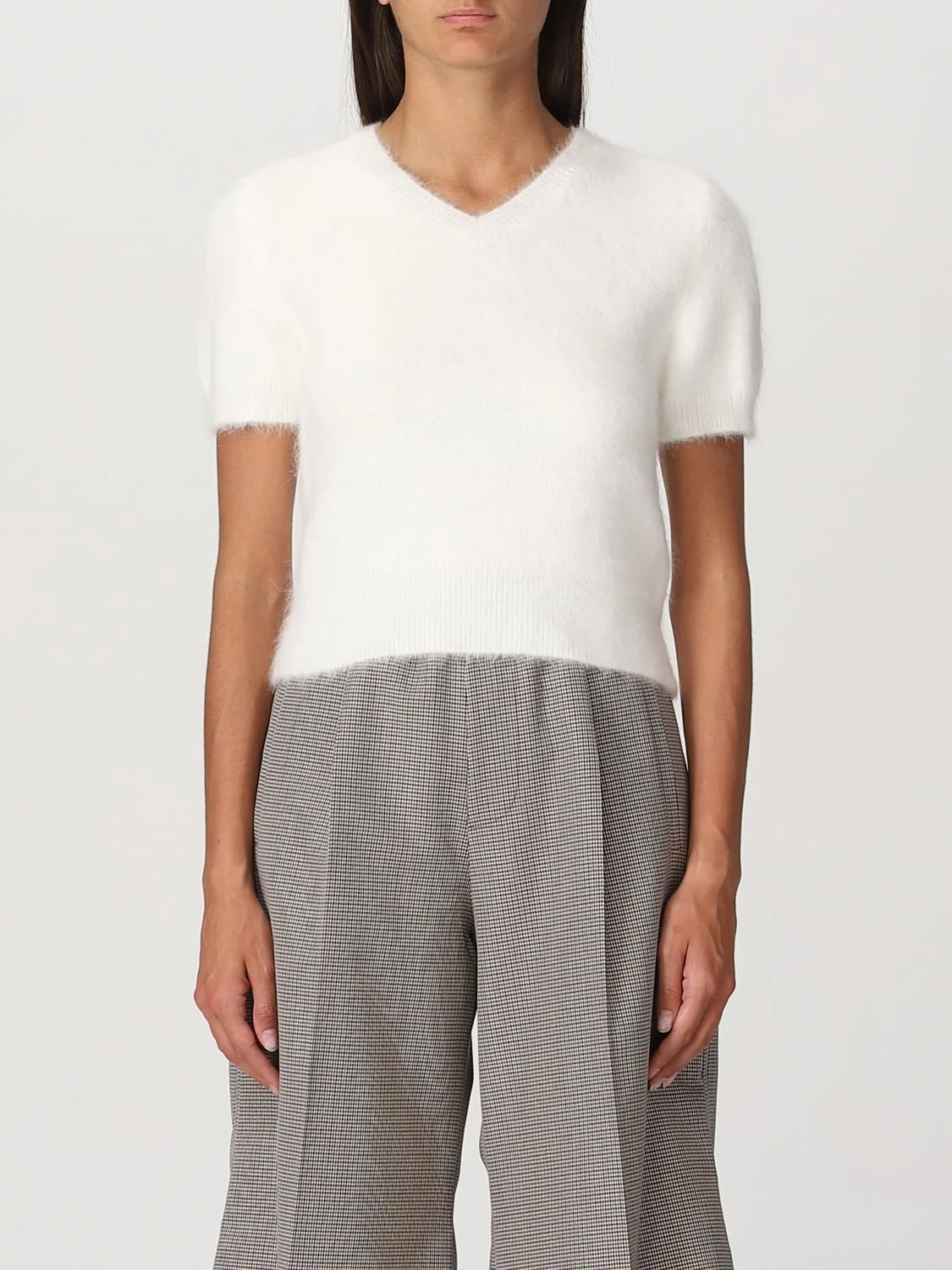 DESCRIPTION - Style: Minimal - Neckline: V neckline - Shoulders: Regular - Sleeves: Short - Bottom: With straight hemline - Materials: Angora wool - Pattern: Plain-colored DETAILS AND CARE Composition 80%WA 20%PA SIZE AND FIT Sizes not available Size and fit Cropped fita , Slim fit Designer code: S29HN0003S18269 101 Giglio Code: E58607 Designer: Maison Margiela Collection: Maison Margiela Woman Category: Clothing Maison Margiela