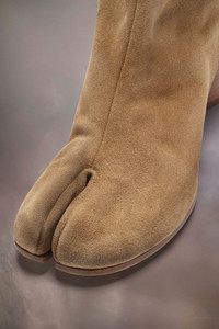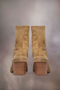 Crafted from suede with a used treatment created by hand, the ankle boots have a 6cm cylindrical heel. The back features a single white stitch showing the hand of Maison Margiela. They feature the Tabi split-toe shape, inspired by the traditional 15th century Japanese sock bearing the same name – launched for the Maison's debut collection in 1989. It captures the avant-garde and insubordinate spirit of the Maison and exists as a heritage classic, continually explored through each collection. Product Details Item ID S58WU0246P4350T2279 Upper: 100% calf leather Lining: 100% lamb leather Inside: 100% lamb leather Sole: 100% calf leather Contrast: 100% rubber Heel height: 6 cm/2,3 in Cylindrical heel Ankle boots in suede calf leather with aged treatment Tabi split toe White stitching at the back Hook closure Gently brush with a delicate brush to clean Made in Italy A digital certificate provided by the Aura Blockchain Consortium guarantees the authenticity of this product. Discover more on auraluxuryblockchain.com/#about