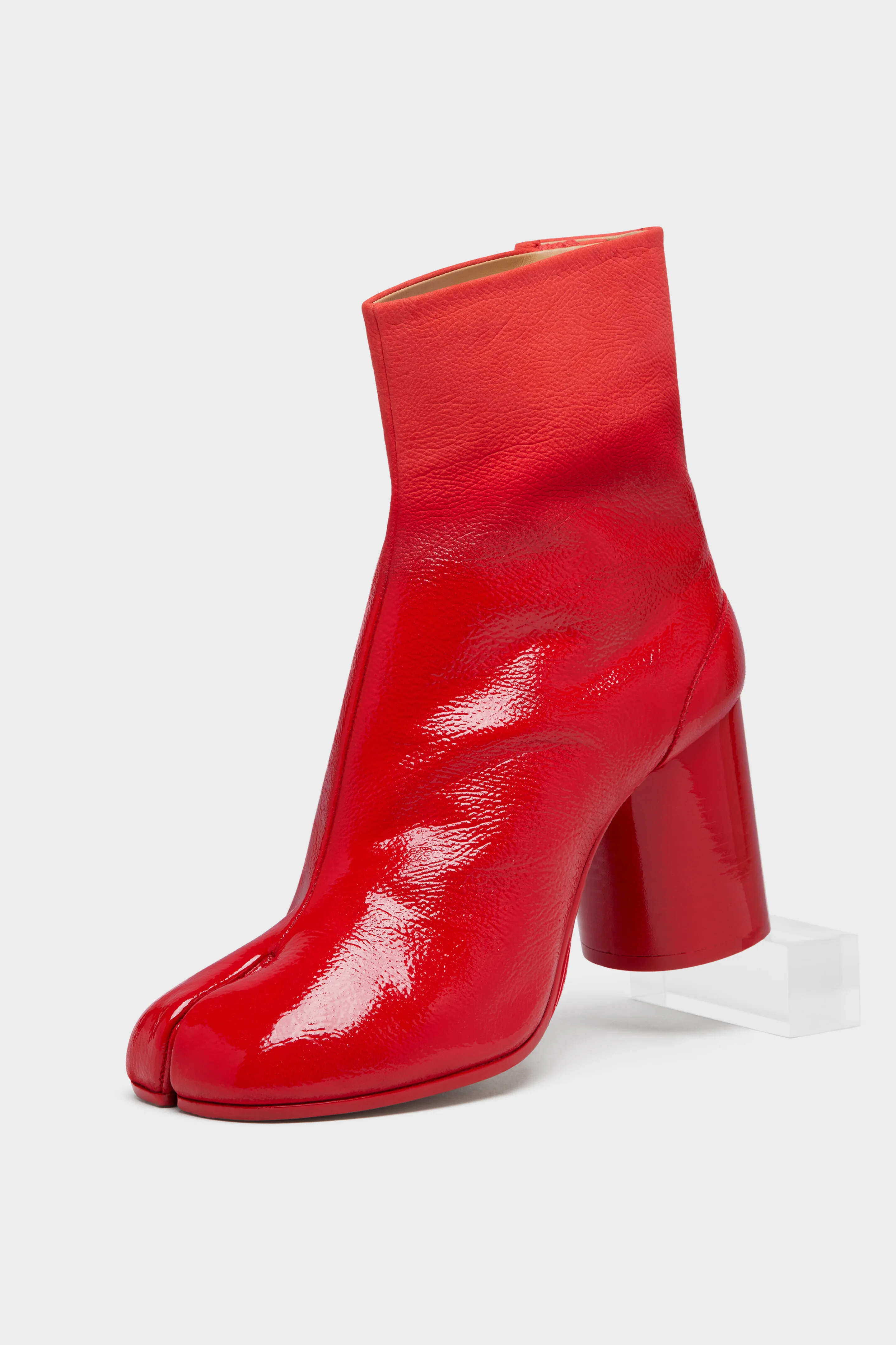 Crafted in matte leather with a patent spray treatment, these Tabi ankle boots combine a soft, tactile base with a high-shine surface finish. The iconic split-toe construction references traditional Japanese socks from the 15th century, first introduced by the Maison in the Spring Summer 1989 collection. Set on a cylindrical heel. At the back, the Maison’s signature single white stitch appears. Product Details Item ID S58WU0260P7644T4417 Upper: 100% calf leather Lining: 100% ovine leather Inside: 100% ovine leather Sole: 100% calf leather Contrast: 100% rubber Heel height: 8 cm Cylindrical heel Tabi split toe Made in Italy