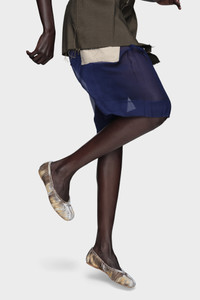 The Tabi ballerina is crafted in pleated velvet, laser-treated and hand distressed evoke the passage of time. The result is a textured patina – one that speaks of memory, motion, and craft. A supple ovine lining and sleek leather sole provide tactile contrast to the sculptural upper. They feature the Tabi split-toe, inspired by the traditional 15th century Japanese sock bearing the same name – launched for the Maison's debut collection in 1989. It captures the avant-garde and insubordinate spirit of the Maison and exists as a heritage classic, continually explored through each collection. Maison Margiela's signature single white stitch appears at the back. Product Details Item ID S58WZ0145P7418T2585 Upper: 65% Viscose-Rayon 35% Cupro Lining: 100% Ovine Leather Inside: 100% Ovine Leather Contrast: 65% Viscose-Rayon 35% Cupro Sole: 100% Calf Leather Contrast: 100% Rubber Tabi ballet flats in viscose-cupro velvet Knotted detail Maison Margiela signature at the insole White stitching at the back Made in Italy