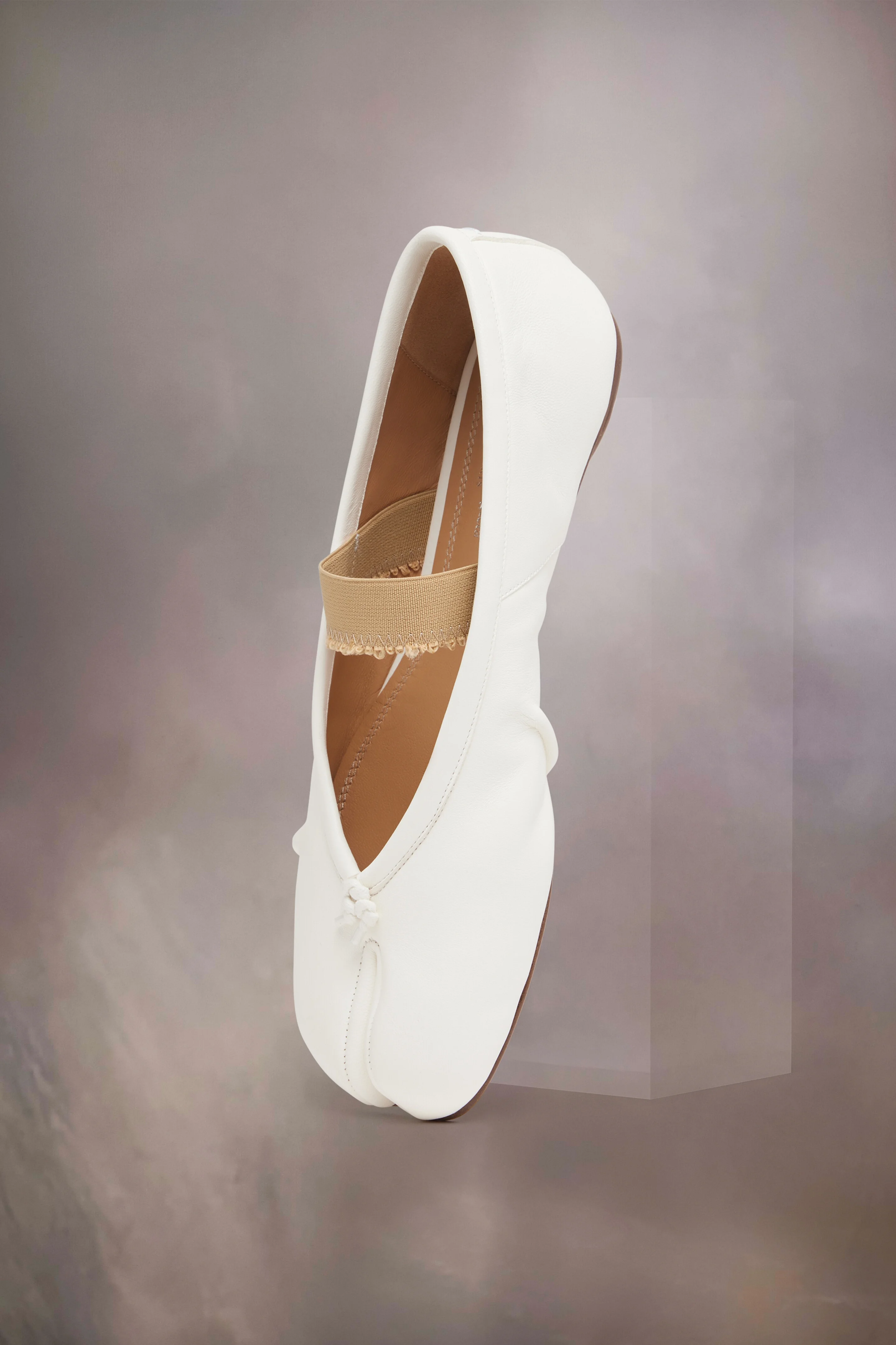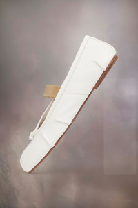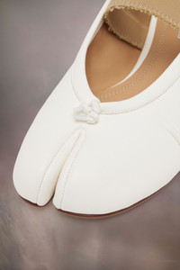 In leather with handmade folds, the ballerinas feature a distressed elastic band and the Tabi split-toe, inspired by the traditional 15th century Japanese sock bearing the same name – launched for the Maison's debut collection in 1989. It captures the avant-garde and insubordinate spirit of the Maison and exists as a heritage classic, continually explored through each collection. Product Details Item ID S39WZ0104P6853HA333 Upper: 100% lamb leather Lining: 100% lamb leather Inside: 100% lamb leather Sole: 100% calf leather Contrast: 100% rubber Ballerina shoes in nappa leather External elastic band with worn treatment Tabi split toe Handmade leather folds Cotton knot at the front White stitching at the back Maison Margiela logo on the sole Due to the delicacy of nappa leather, it is recommended to use vegetable leather products for care and maintenance Made in Italy A digital certificate provided by the Aura Blockchain Consortium guarantees the authenticity of this product. Discover more on auraluxuryblockchain.com/#about