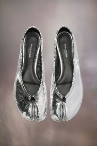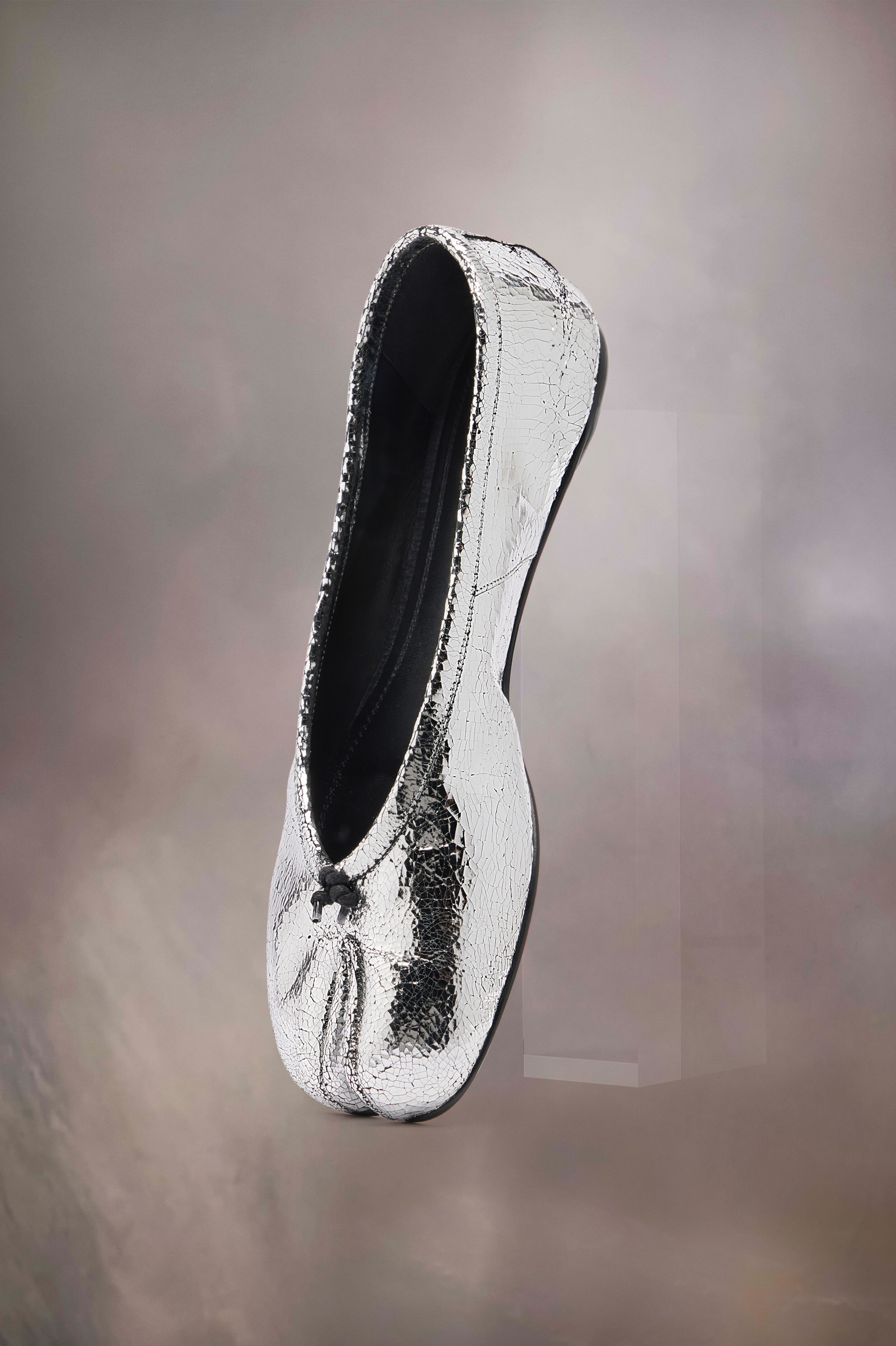 Maison Margiela presents the Tabi new ballerinas, which take their design from ballerina shoes in the house archives. In a broken mirror finish, crafted from leather, the pair feature the Tabi split-toe, inspired by the traditional 15th century Japanese sock bearing the same name – launched for the Maison's debut collection in 1989. It captures the avant-garde and insubordinate spirit of the Maison and exists as a heritage classic, continually explored through each collection. Product Details Item ID S58WZ0130P5016T9002 Upper: 100% calf leather Lining: 100% lamb leather Inside: 100% lamb leather Sole: 100% calf leather Contrast: 100% rubber Ballerina shoes with broken mirror effect Tabi split toe Cotton knot White stitching at the back Brand logo on the insole Made in Italy A digital certificate provided by the Aura Blockchain Consortium guarantees the authenticity of this product. Discover more on auraluxuryblockchain.com/#about